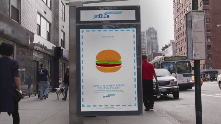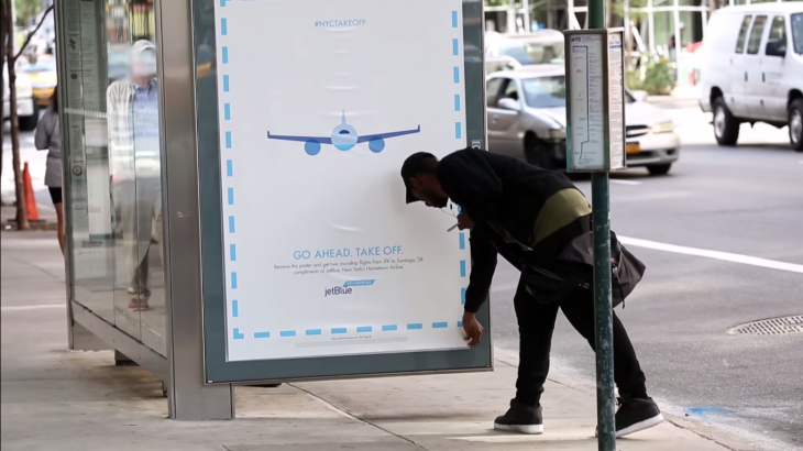 Havayolu şirketi JetBlue, hazırladığı kampanyada insanlardan, 15 farklı bölgede, 181 otobüs durağına yerleştirdiği posterlerini güpegündüz yürütmelerini teklif ediyor.