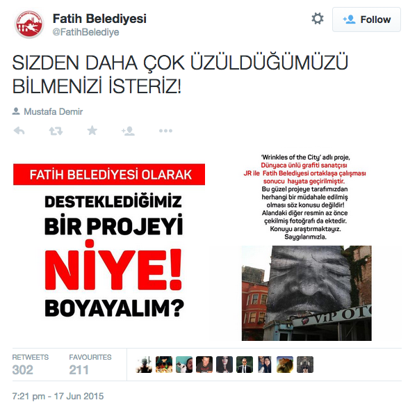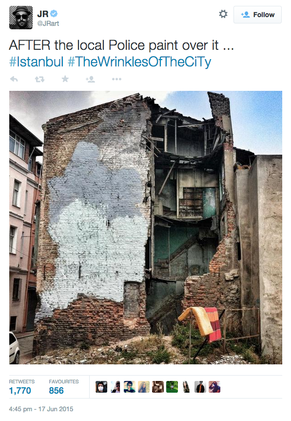 Eserlerin varlığı bile göğsümüzü kabartmaya yetiyordu. Dünyaca ünlü bir ismin eserlerinin Istanbul’da yer alması bile güzel hisler uyandırıyordu içimizde. Fakat dün akşam eserlerinden birisi boyandı. Önce Fatih Belediyesi zabıta ekipleri tarafından boyandığı söylendi. Ardından Fatih Belediyesi Twitter hesabından açıklama yaparak projede JR ile birlikte çalıştıklarını ve bunun mümkün olmadığını söyledi.