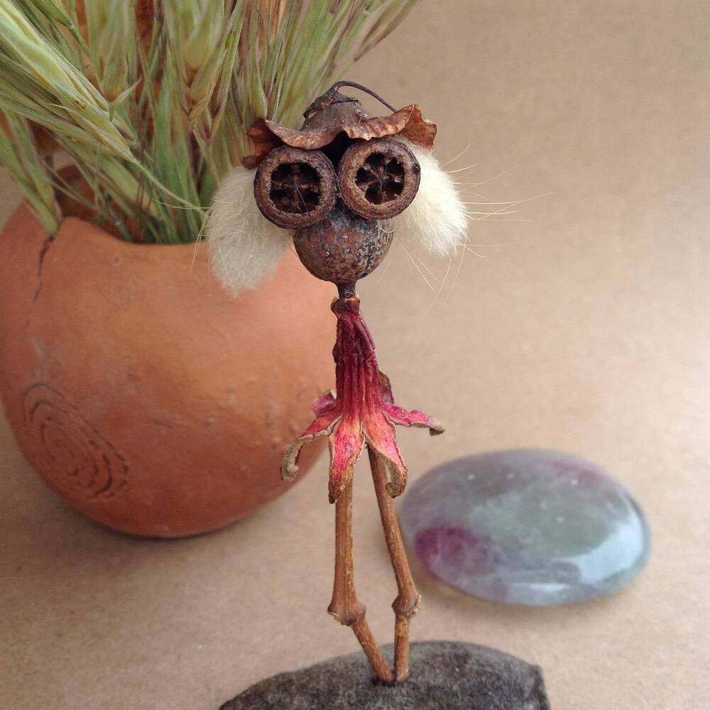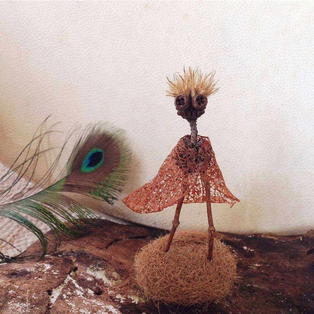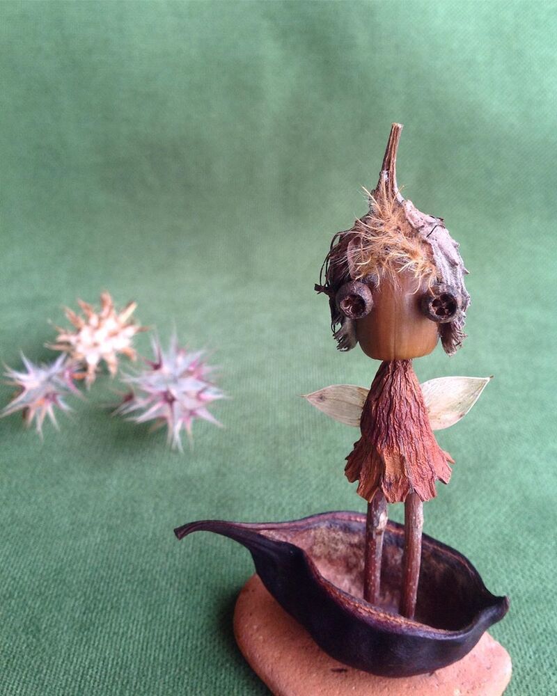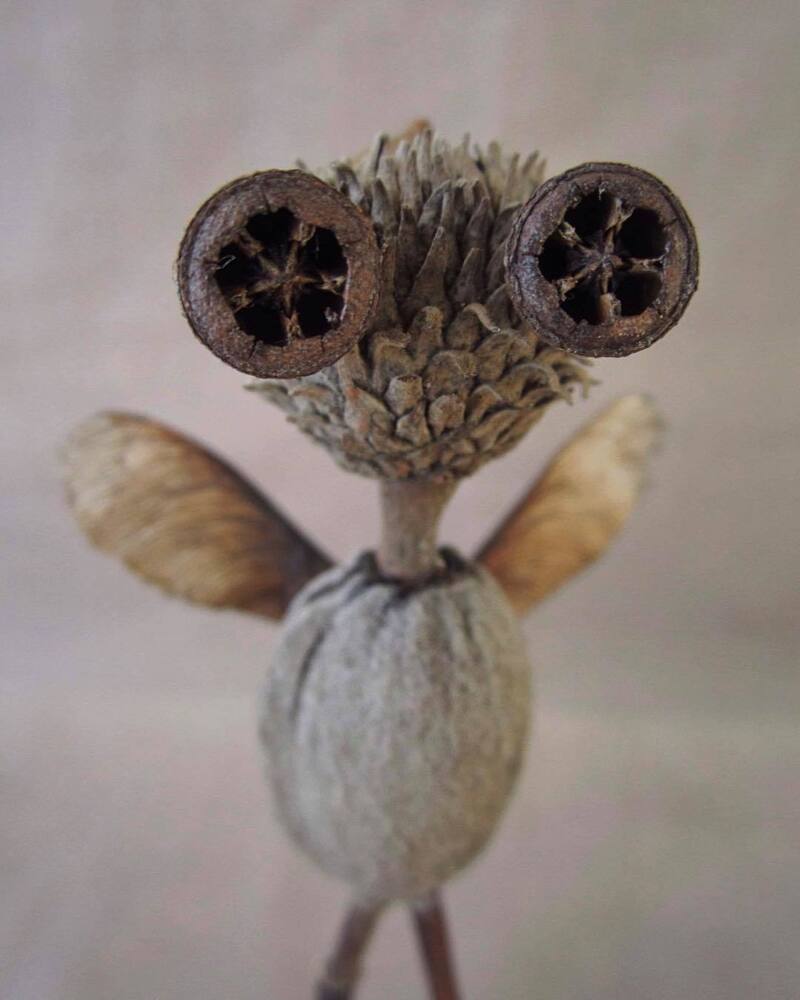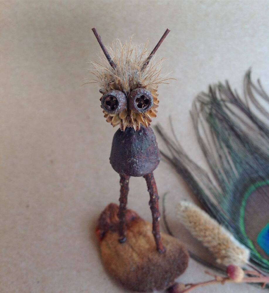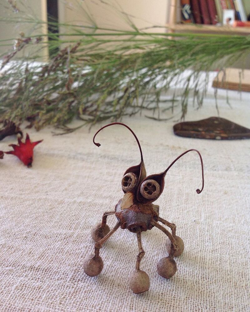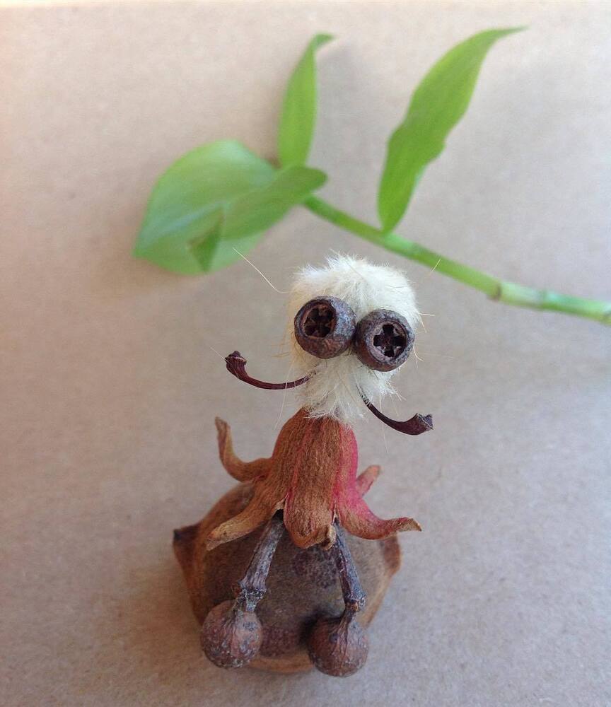 Nihayet Cihan: Doğadan topladığım malzemeler saymakla bitmez aslında. 8 senedir biriktirdiğim bu hazineler, baktıkça beni bile hayrete düşürüyor. Tohumlar ve kozaları, ağaçlardan, çiçeklerden, bitkilerden yerlere düşmüş herhangi parçalar, kuru çiçekler, ölü böcek ve kelebek kanatları, fırtınalı günler sonrasında deniz kıyılarından topladığım bilimum ağaç parçaları, dalları ve kabukları, olgunlaşamadan yere düşmüş meyveler… Şimdiye dek toplamış olduğum, kullandığım ve masamda bulunan bu doğal malzemelerin yüzde 95’inin adını bilmiyorum, benim için bu mümkün değil ve böyle bir bilgi birikimi gerekliliği hissetmiyorum bu anlamda. Aşırı mesai gerektiren her şeyden kaçıyorum yani:) En sık kullandığım malzemeler arasında farklı çeşitte okaliptüs ağaçlarının tohum kozaları var. Evet en sevdiğim gözler onlar:) Bu üretim sürecinin ilk yıllarında doğal malzemeler ile birlikte geri dönüşüm malzemeleri, oyun hamurları, boncuk gibi diğer malzemeleri de kullanıyordum fakat son 4 senedir sadece doğadan topladığım malzemeleri kullanıyorum. Bu dönüşüm ile beraber yapmış olduğum bu karakterler Jungle Dudes ismini aldı.