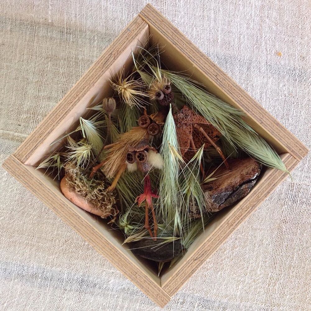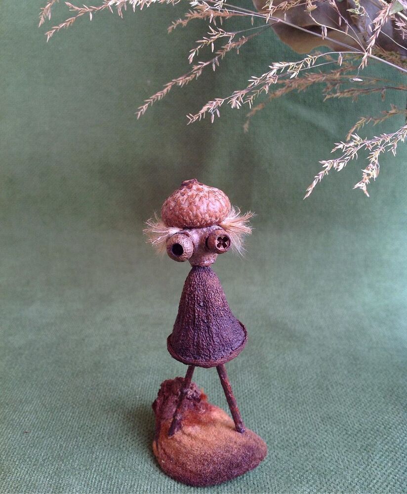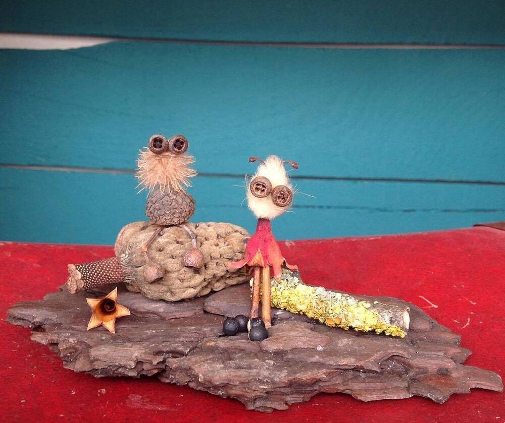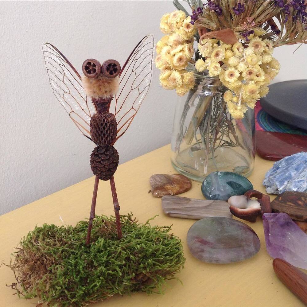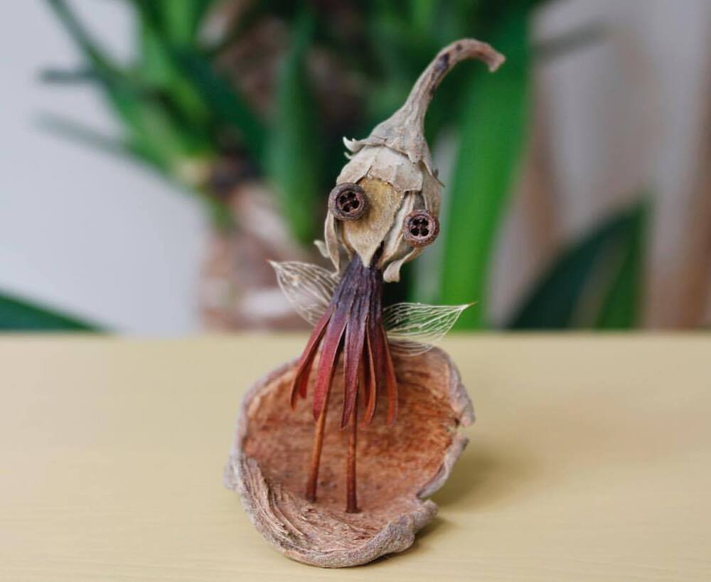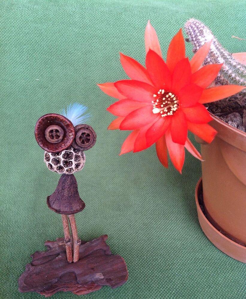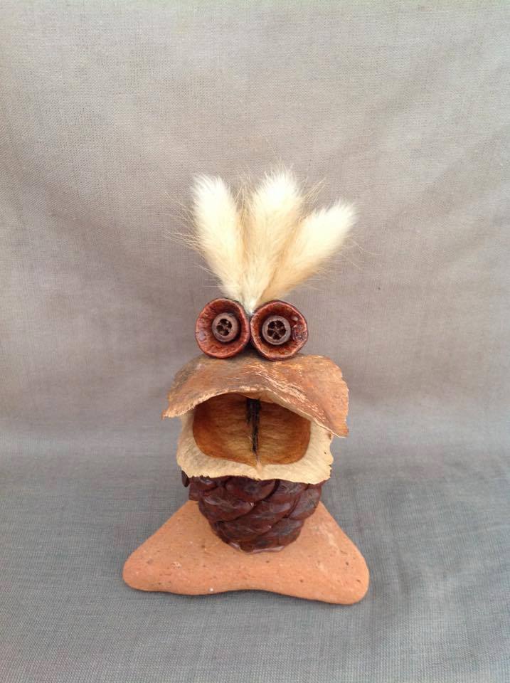 Nihayet Cihan: Doğadan topladığım malzemeler saymakla bitmez aslında. 8 senedir biriktirdiğim bu hazineler, baktıkça beni bile hayrete düşürüyor. Tohumlar ve kozaları, ağaçlardan, çiçeklerden, bitkilerden yerlere düşmüş herhangi parçalar, kuru çiçekler, ölü böcek ve kelebek kanatları, fırtınalı günler sonrasında deniz kıyılarından topladığım bilimum ağaç parçaları, dalları ve kabukları, olgunlaşamadan yere düşmüş meyveler… Şimdiye dek toplamış olduğum, kullandığım ve masamda bulunan bu doğal malzemelerin yüzde 95’inin adını bilmiyorum, benim için bu mümkün değil ve böyle bir bilgi birikimi gerekliliği hissetmiyorum bu anlamda. Aşırı mesai gerektiren her şeyden kaçıyorum yani:) En sık kullandığım malzemeler arasında farklı çeşitte okaliptüs ağaçlarının tohum kozaları var. Evet en sevdiğim gözler onlar:) Bu üretim sürecinin ilk yıllarında doğal malzemeler ile birlikte geri dönüşüm malzemeleri, oyun hamurları, boncuk gibi diğer malzemeleri de kullanıyordum fakat son 4 senedir sadece doğadan topladığım malzemeleri kullanıyorum. Bu dönüşüm ile beraber yapmış olduğum bu karakterler Jungle Dudes ismini aldı.