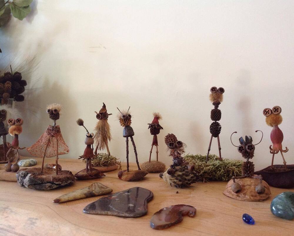 Kullandığın malzemelerin neler olduğunu biraz anlatabilir misin? Beton yığını şehirlerde doğup büyüyen insanlar için hepsini tanımak kolay değil. Özellikle favorin olan bir malzeme var mı? Örneğin gözlerde sık sık aynı malzemeyi kullandığını görüyorum, çıkaramadım ne olduğunu:) Doğadan topladıklarının yanı sıra ufak tefek hazır malzemeleri (boncuk vb) de işin içine katıyor musun?