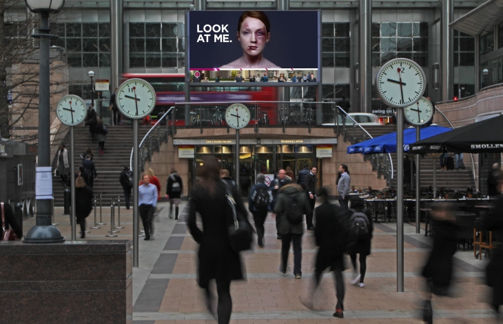Women’s Aid, kadına karşı şiddeti toplumu bilinçlendirerek çözülebileceğine inandığı bir proje başlatıyor. Hazırladığı açıkhava reklamında aile içi şiddet görmüş, iki gözü morarmış ve tartaklanmış bir kadın bütün gün yoldan geçen insanlara bakıyor. Her birini görüyor, takip ediyor ve bakmalarını bekliyor. Eğer kadına bakmayı reddedip yürümeye devam edenler olursa kadın yaralarıyla baş başa yaşamaya devam ediyor.