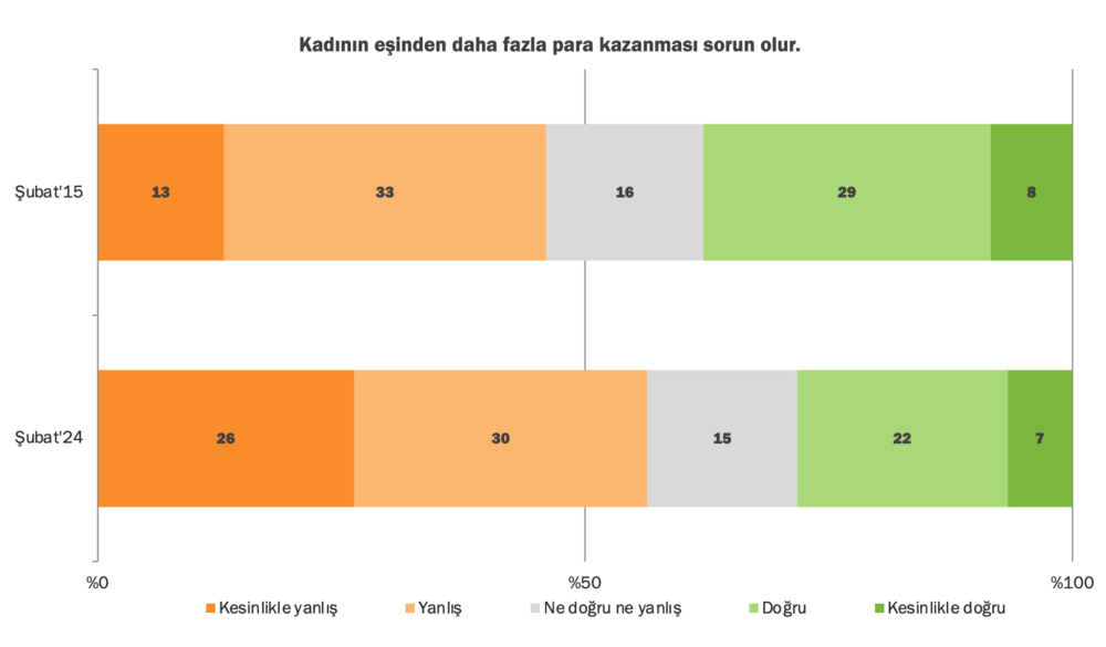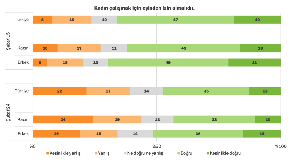 Rapora göre “kadın çalışmak için eşinden izin almalıdır” yargısını doğru bulanların oranı 10 yıl önceye göre azalmış görünüyor. 10 yıl önce Türkiye toplumunun yüzde 66’sı bu yargıyı doğru bulurken, günümüzde bu oranın yüzde 48 olduğu görülüyor. Bu ifadeye katılmayanların oranında ise yüzde 15 oranında bir artış olmuş.