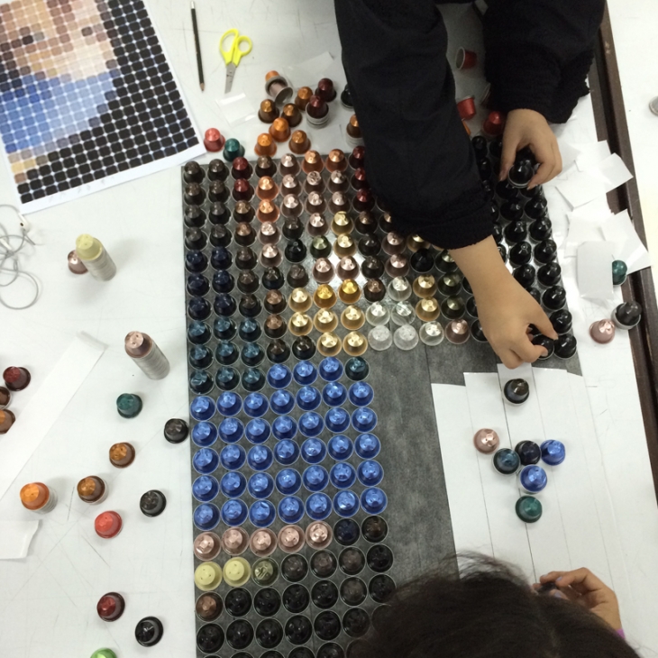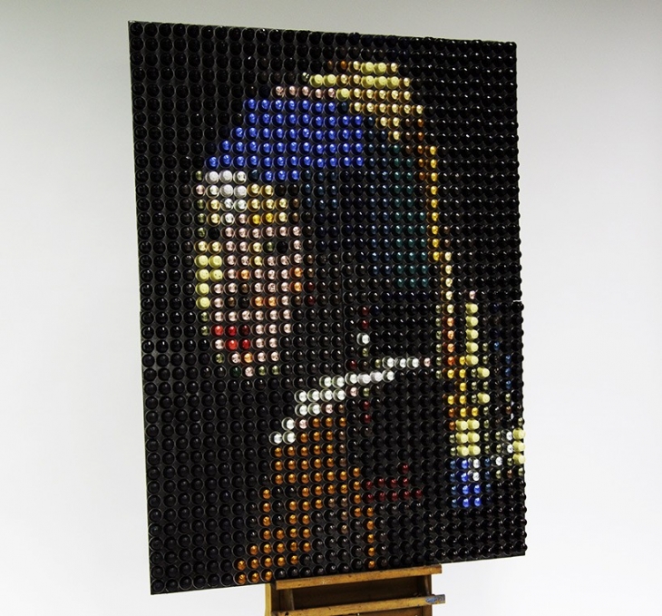 Dubai’deki Amerikan Üniversitesi sanat öğrencilerinin hayata geçirdiği projede, küçük, renkli kahve kapsülleriyle İnci Küpeli Kız tablosu yeniden yorumlanmış.