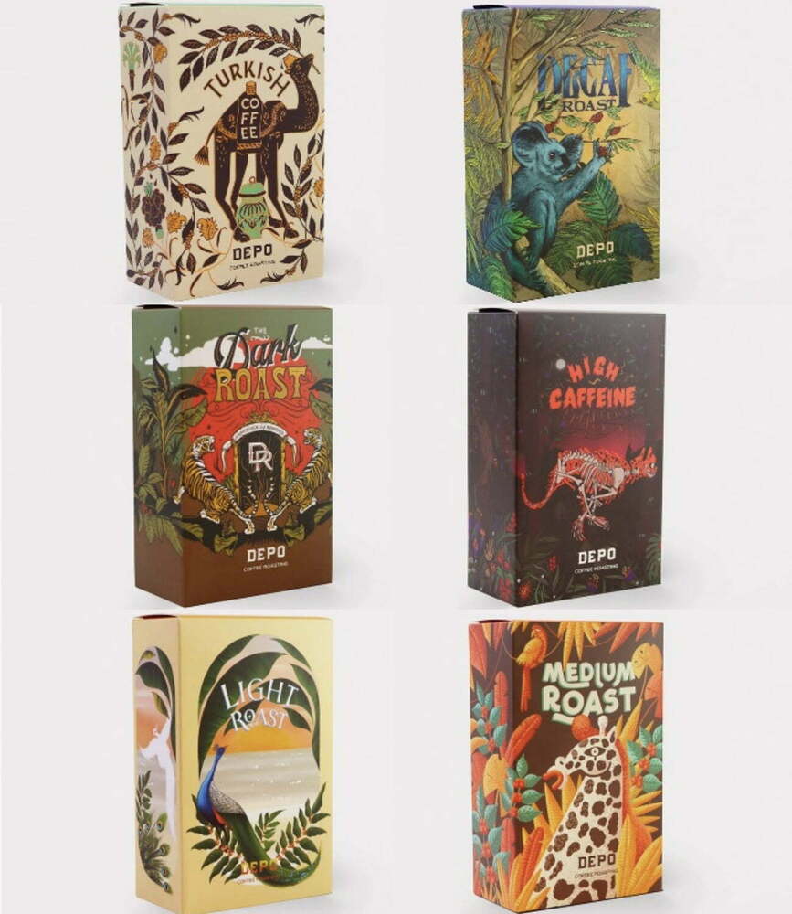 Ambalajın ön tarafında Depo Coffee Roasting logosu ve her kavrulma çeşidi için öne çıkarılan hayvan yer alıyor. Arka tarafta ise illüstratörlerin çizimlerine yer veriliyor. Ayrıca yine ön kısımda her kahvenin temel bilgilerinin yer aldığı bir etiket bulunuyor.