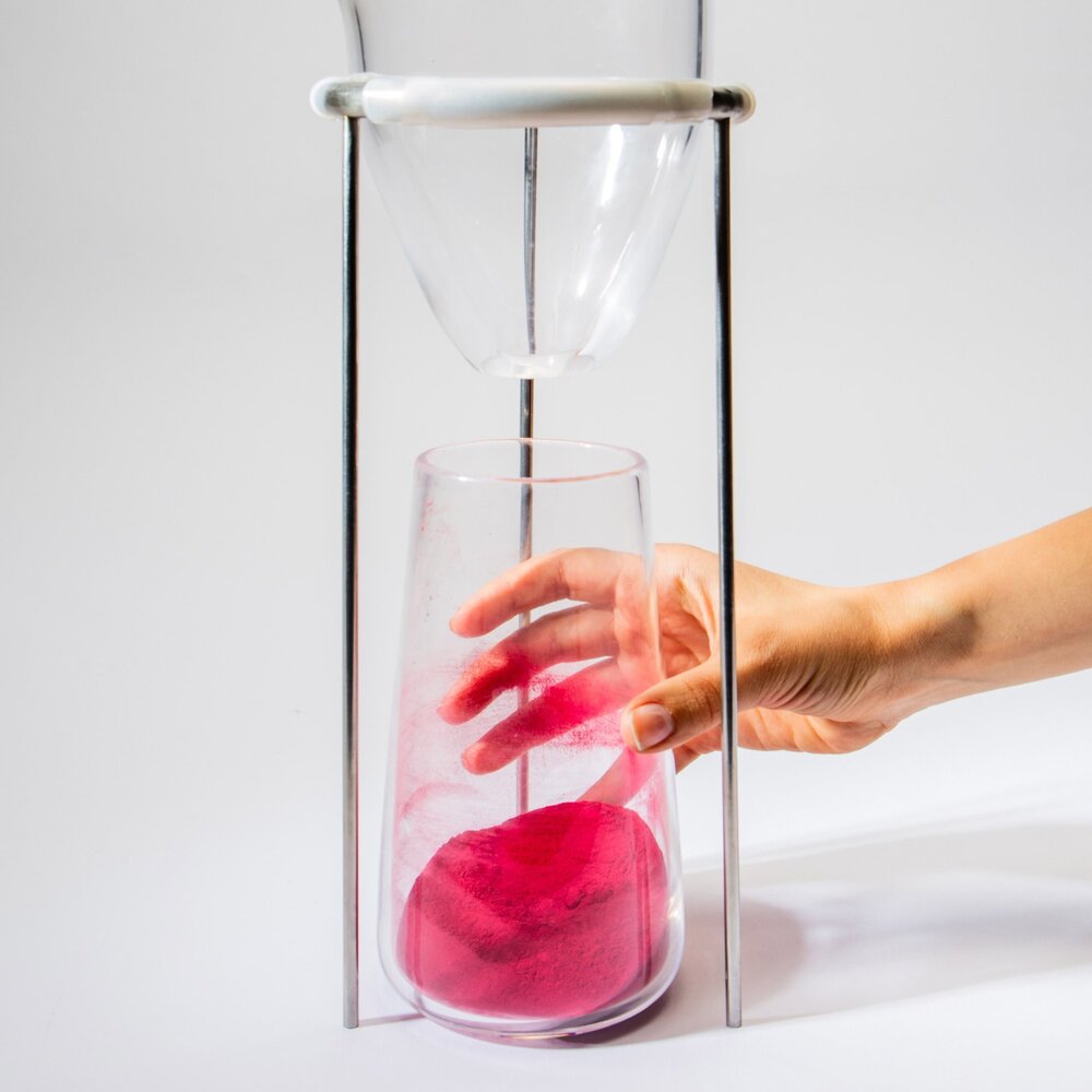 Suda kaynattığınız meyve ve sebze kabuklarını Kaiku’nun haznesine yerleştirerek süreci başlatıyorsunuz. Buradaki renkli karışım, sıcak ve basınçlı havayla birlikte, atomize edici bir başlıktan vakumlanarak ana cam hazneye çekiliyor. Karışım neredeyse hemen buharlaşacak kadar sıcakken kuru partiküller bu hazneden ayrı bir hazneye vakumlanıyor. Böylece boya pigmentleri elde edilmiş oluyor.