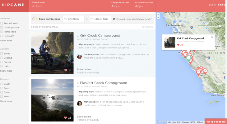 ABD’de doğaya karışmak isteyenler için en can alıcı sorunlarından biri olarak ulusal parklara rezervasyon yaptırma süreci gösteriliyor. Gidilecek parka ulaşım bir şekilde çözülürken kamp yapılacak yerin rezervasyonu için aylarca beklemek ABD sınırları içinde kamp yapanlar için büyük bir dert. Kamp severlerin ya da hayatında ilk kez bir kamp macerasına atılmak isteyenlerin işe nerden başlayacağını çözmek için sayısız sitede kendilerini kaybedeceği detayını da unutmamak gerek. Hipcamp ise rezervasyon sürecindeki hantallığa olabildiğince çözüm getirerek geri kalan sıkıntıları da en aza indiriyor.