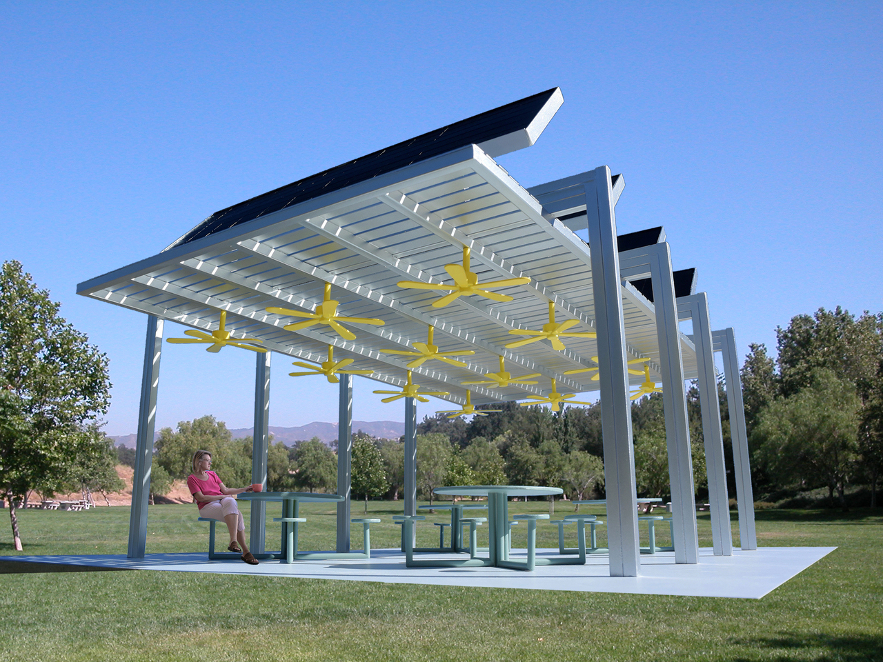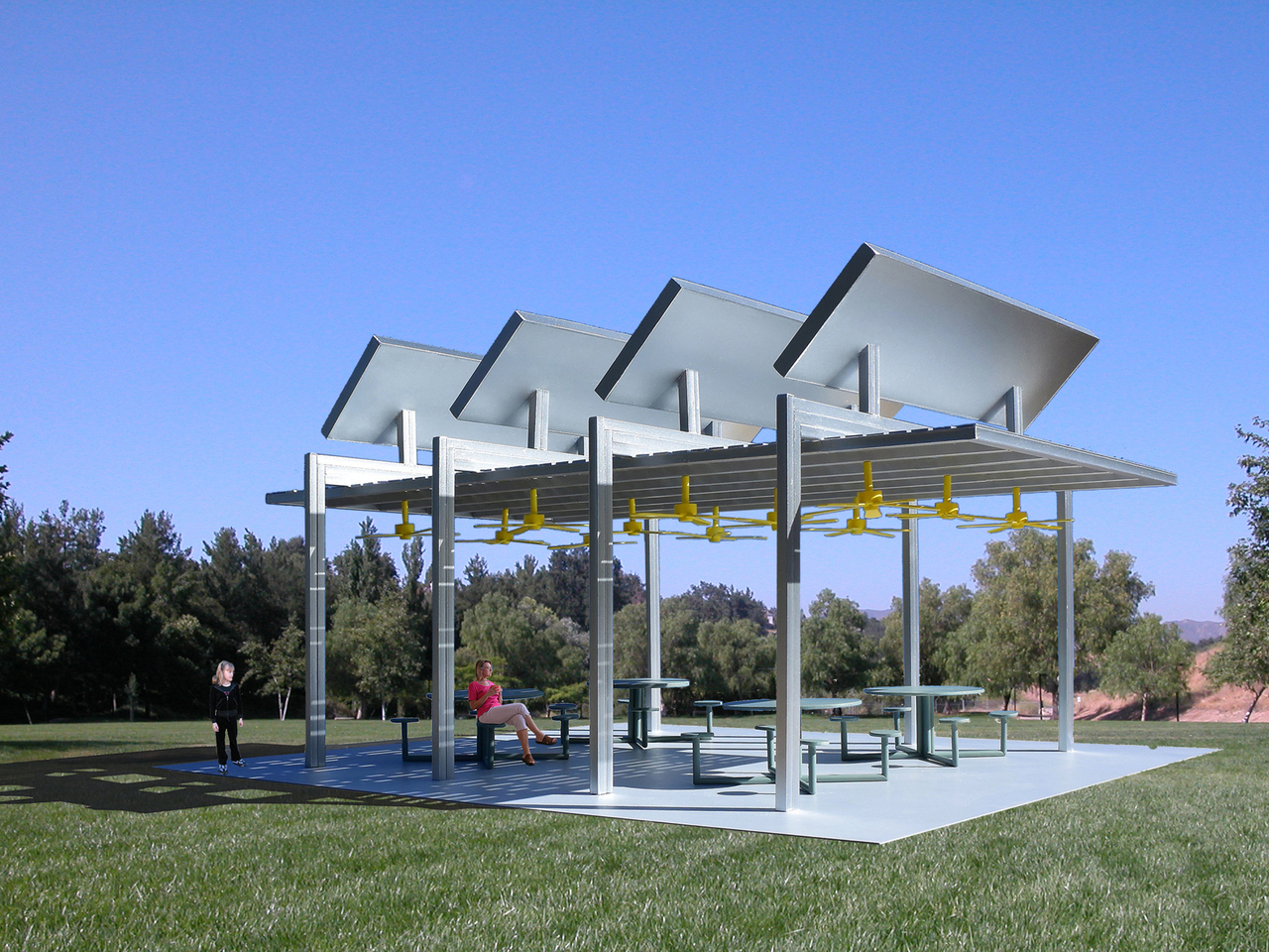 “Solar Ceiling Fan Pavilion”, en sade çözüm olarak öne çıkıyor. Açık çerçeveli yapının çatısına yerleştirilen eğimli güneş panelleri, altındaki tavan vantilatörlerini çalıştırıyor. Güneş panelleri güneş ışığını topluyor, bu enerji fanları besliyor ve altındaki alan serin kalıyor. Serin günlerde fanlar çalışmadığından, üretilen fazla elektrik yerel şebekeye aktarılıyor.