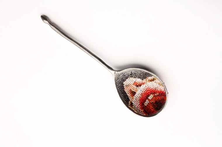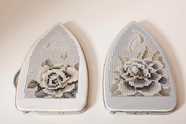 Severija Incirauskaite-Kriauneviciene, eski ve paslı objeler üzerine kanaviçeler işleyerek beklenmedik kombinasyonlar yaratıyor.