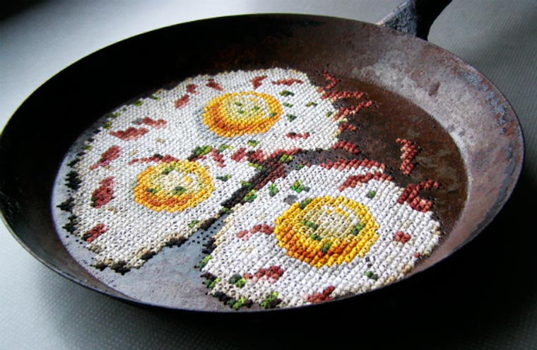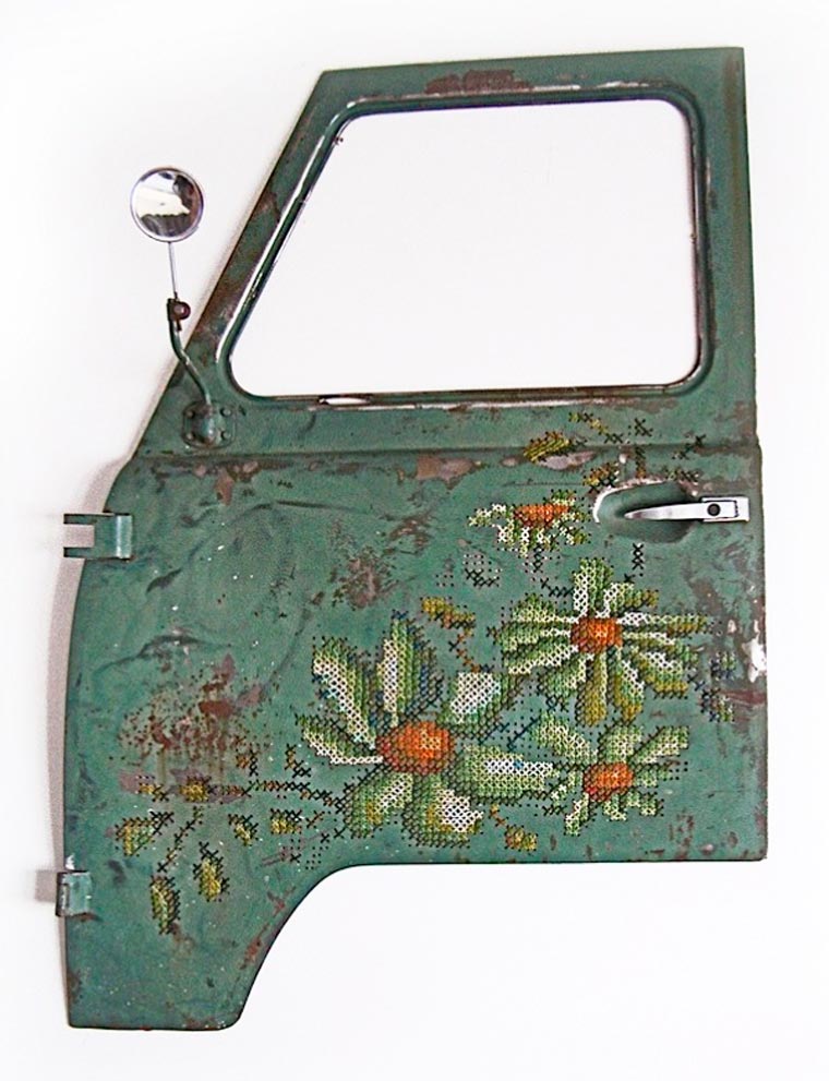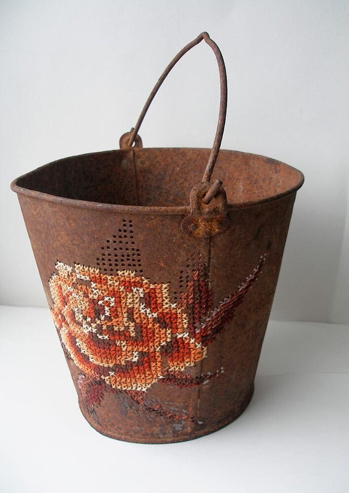 Sokak sanatında, raketlerde ve dövmelerde rastladığımız kanaviçe etkilerinden sonra sıra hurdaya dönüşmüş metal objelerin üzerine işlenen kanaviçe örneklerinde. Severija Incirauskaite-Kriauneviciene’nin örtü yerine metal üzerine işlediği bu kanaviçeler, oyma çiçek desenleriyle dantel gibi işlenen paslı küreklerden sonra bir başka eskiye yeniden hayat verme yöntemi olarak gözümüzü gönlümüzü açıyor.