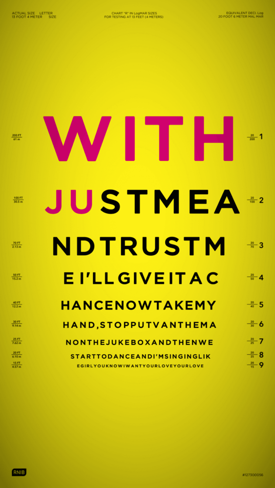 “Karaoke Eye Test” Glastonbury Festivalinin sağlık sponsorlarından olan RNIB için CHI&Partners, The&Partnership, içerik stüdyosu MPC Creative ve küresel karaoke tedarikçisi Sunfly iş birliğiyle gerçekleştirildi. Çalışma için sahnelerden birinin yanına bir çadır kurularak dileyen festival ziyaretçisine ücretsiz göz muayenesi yapıldı. Ancak bu sıradan bir şekilde değil; karaoke aracılığıyla gerçekleştirildi.