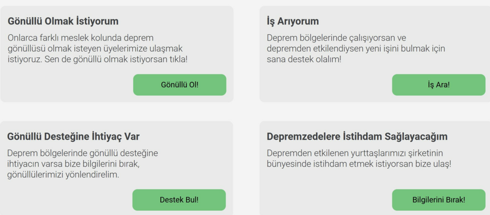 istihdamseferberligi.info adlı platform üzerinden depremzede vatandaşlara istihdam sağlamak isteyen şirketler ve iş bulmak isteyen deprem mağduru vatandaşların yanı sıra ayrıca deprem bölgelerinde gönüllü desteğe ihtiyaç duyanlar ile bu bölgelerde gönüllü görev almak isteyen kişiler de bir araya gelebilecek.
