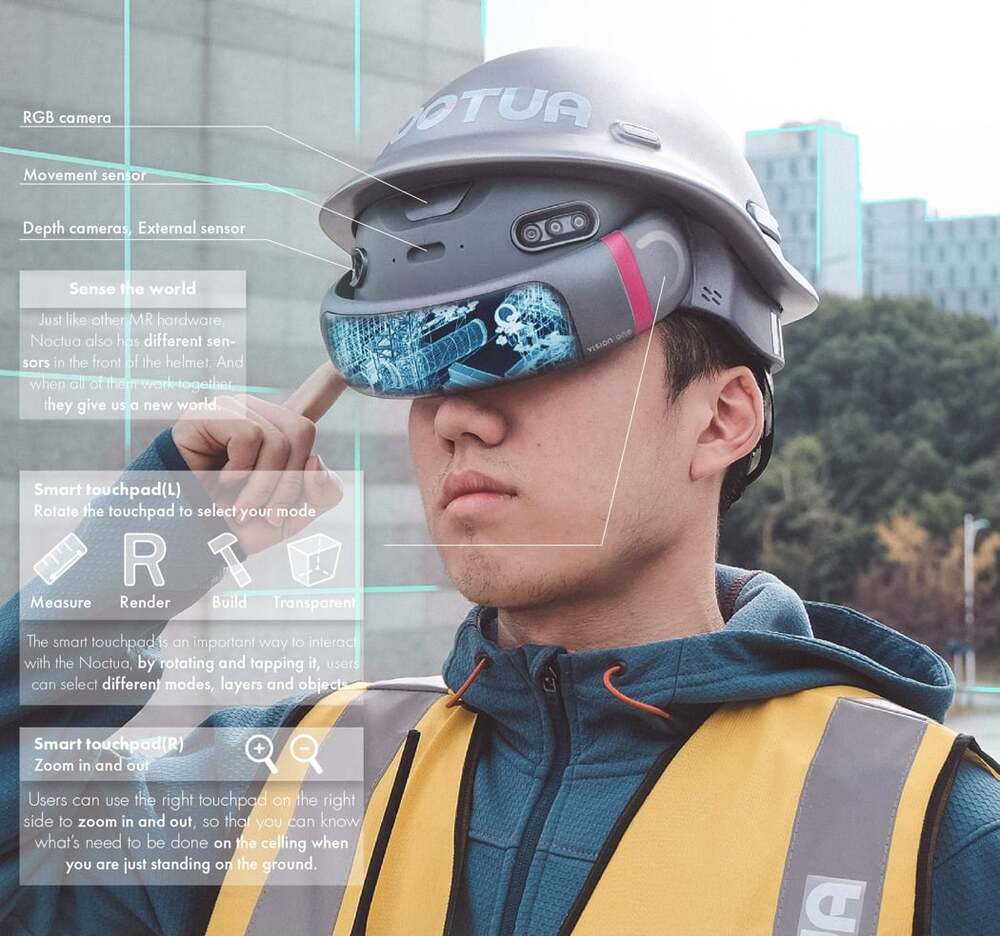 NOCTUA, gerçek ve sanal dünyaları birleştiren holografik görüntüler sunarak inşaat işçisine görevi hakkında içsel bir vizyon kazandırıyor. İnşaat işçilerileri için kolaylık sağlamasının yanı sıra mimarın da daha iyi takip yapabilmesi için tasarlanmış. Bareti kullanmak için üzerindeki gözlük kısmını aşağı çekmek ve ardından render modu, ölçüm modu, şeffaf mod ve inşa modu olmak üzere dört özel mod arasından seçim yapmak yeterli. Yüklenen 3B dosyalar; yapı, boyutlar, gizli nesneler ve son render gibi sanal nesneler oluşturuyor. Bir düğmeye basarak tüm modları kolayca kapatılabiliyor ve karma gerçeklik devreden çıkarılabiliyor.