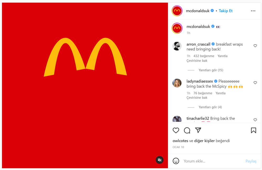 McDonald’s İngiltere, 10 Ocak’ta Instagram hesabından aşağıdaki paylaşımı yaptığında pek çok insan bunu bir logo değişiminin işareti olarak yorumlamıştı.