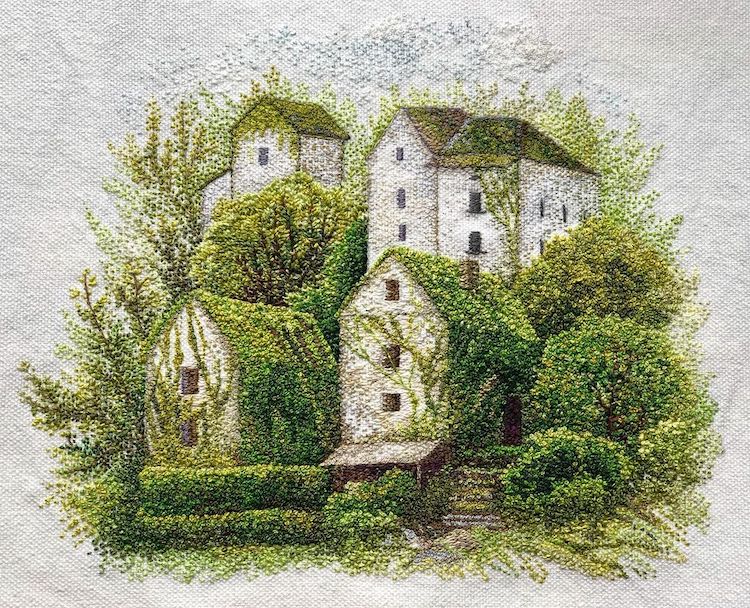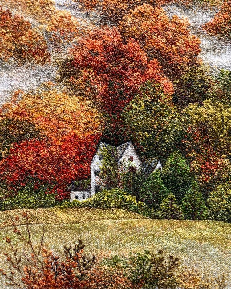 Mimari, portre ve manzara gibi farklı temalarda üretim yapan pek çok nakış sanatçısı keşfettik birlikte. Bunların içinde doğa manzaraları gerçekten de en sık tercih edilen temalardan biri. Vera Shimunia’nın izlenimci manzaraları, Artemis’in polaroid nakış manzaraları ve Zoe Finn’in dağ manzaraları akıllara kazınan örneklerdendi. Katrin Vates de kendi stilinde nakış manzaralar üretiyor.