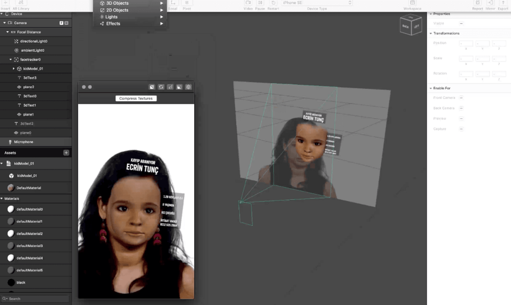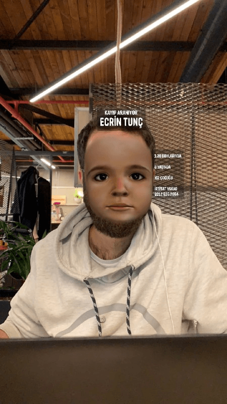 İlk model olarak kayıp Ecrin Tunç kullanıldı. 2015 Haziran ayında evden bakkala diye çıkan küçük çocuktan bir daha haber alınamamıştı. Mardin’in Midyat ilçesinde kaybolan kızın yüzü bilgisayar ortamında yeniden modellendi ve yüz filtreleri arasında eklendi. Filtrenin yanı sıra kaybolan çocuğun ismi, boyu, yaşı, cinsiyeti ve irtibat numarası yüz filtresinin hemen yanında yer alıyor. Bir çocuğun yüzünü detaylı olarak modellemek 2 gün sürüyor.