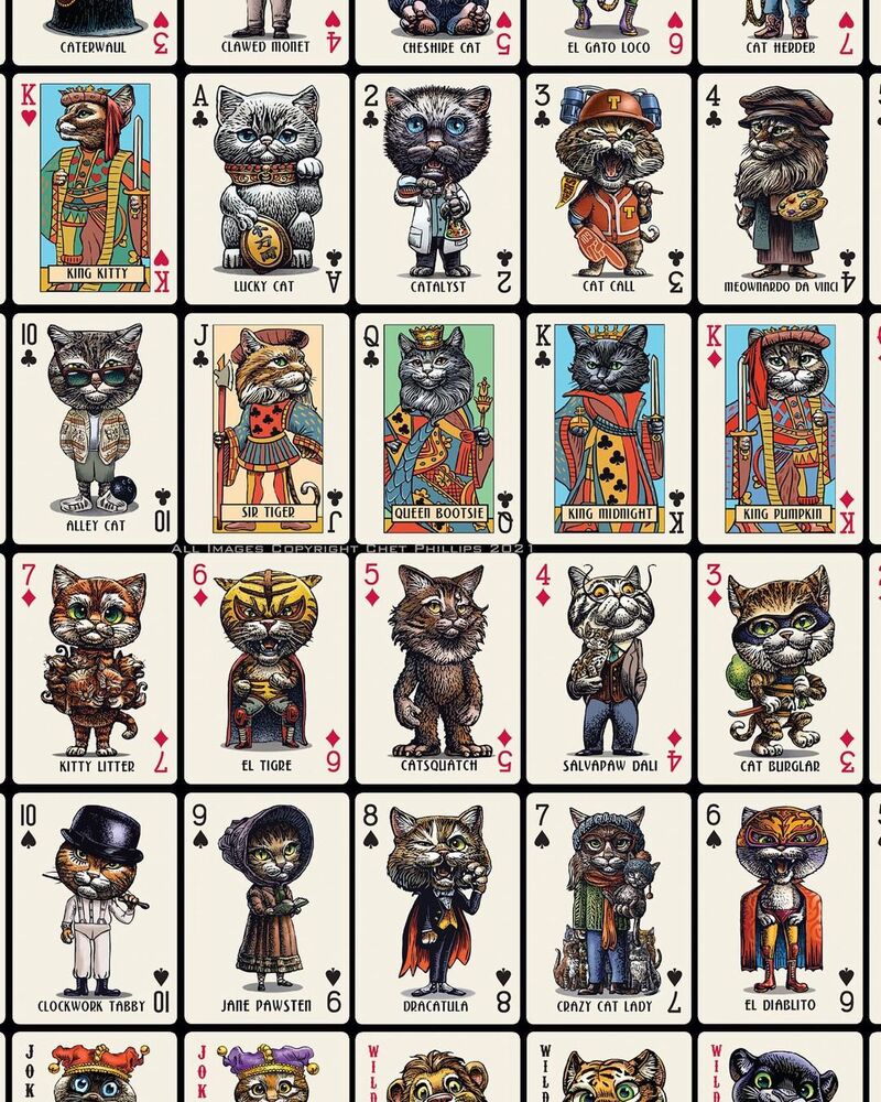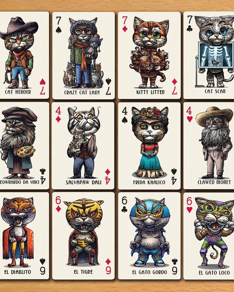 İsimlerin karakterlerle uyumlu olduğu bu destede toplam 58 adet kedi portresi yer alıyor. Oyun kartları, plastik kaplamalı yüksek kalitede ve poker boyutunda. Destede, 4 temel simgenin (maça, kupa, karo ve sinek) yanı sıra 2 joker ve 4 wild card yer alıyor.