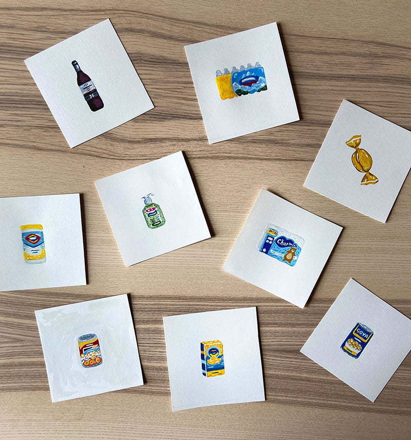 Instagram üzerinde paylaştığı 4×4 inc (10,16×10,16 cm) minicik guaj resimlerde bu ürünleri çizmiş. Arkadaşları, ailesi ve diğer takipçileri bu zor zamanlara dair küçük bir hatıra olarak bu resimlerden satın alıyor. Her biri 30 dolar ve gelirin yarısını Feeding America‘ya bağışlıyor.