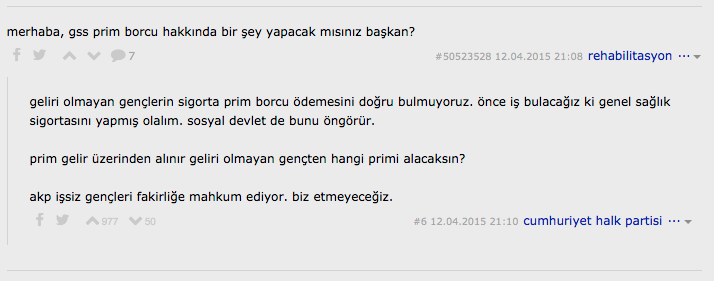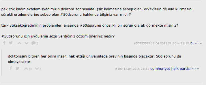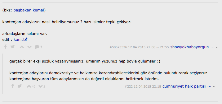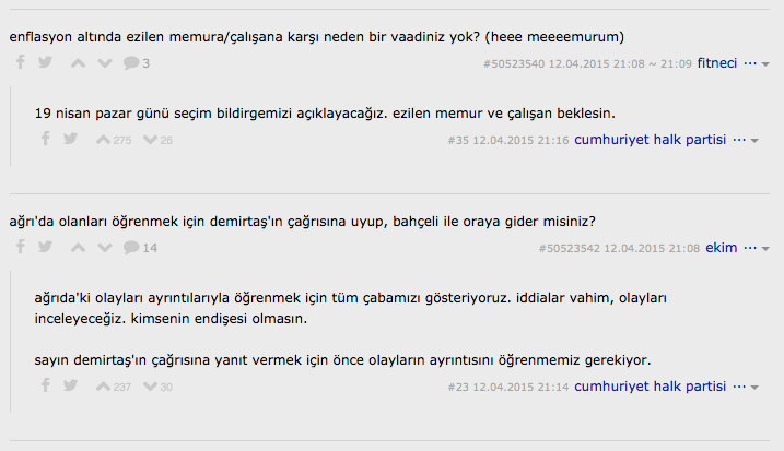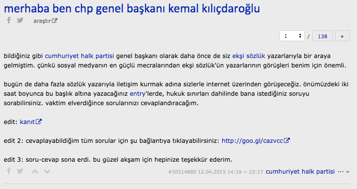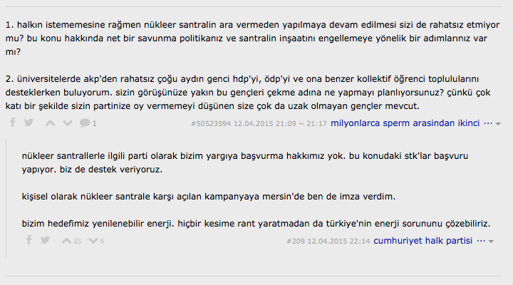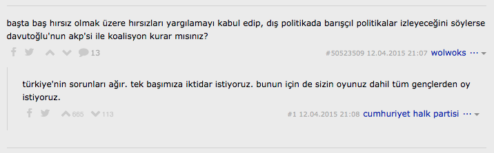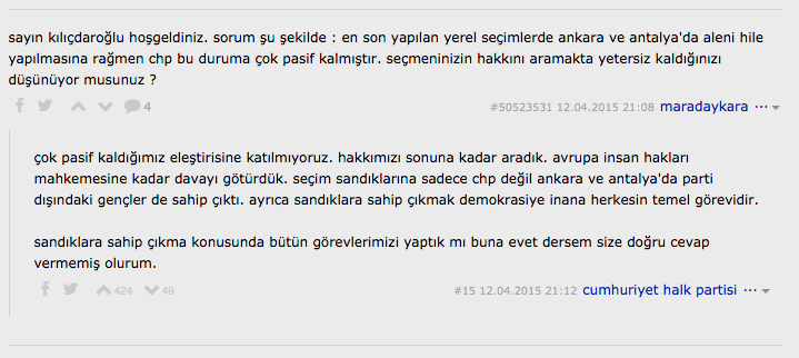 2015 seçimleri için dijital kampanyasında Milletçe Alkışlıyoruz ile başlayan CHP, farklı iletişim modellerini uygulamaya devam ediyor. Yurtdışında büyük şirketlerin, sanatçıların veya siyasetçilerin sıkça kullandığı Soru Cevap Oturumu (Ask Me Anything, AMA) formatını, Ekşi Sözlük üzerinde açtığı başlıkla seçim kampanyasına dahil etti.