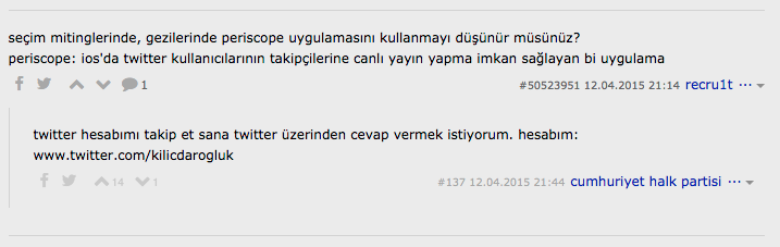 Kılıçdaroğlu, “Periscope’u seçim sürecinde kullanacak mısınız?” sorusunu Twitter hesabına yönlendirerek yanıtlamıştı. Twitter hesabını açtığınızda ise takipçilerini Periscope yayınıyla karşılıyordu. Kılıçdaroğlun’un yanıtladığı tüm sorulara buradan ulaşabilirsiniz.
