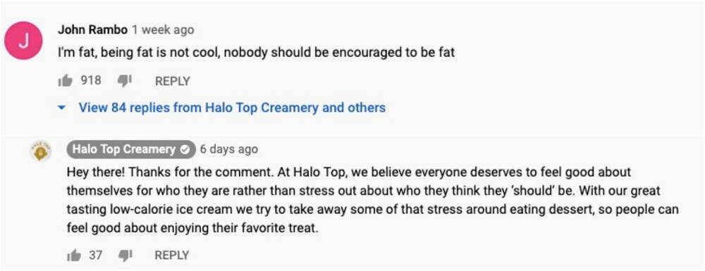 Halo Top her ne kadar büyük beden ölçülere sahip bir kadın modele reklamında yer vermiş olsa da reklam filminin YouTube yorumlarında ve sosyal medyada olumsuz yorumlarla da karşılaşıyor. En çok beğeni alan yorumlardan birinde kullanıcı kendisinin de kilolu olduğunu ve kilolu olmanın havalı bir şey olmadığını söylüyor. İnsanları bu konuda teşvik etmenin yanlış olduğunu ifade ediyor.
