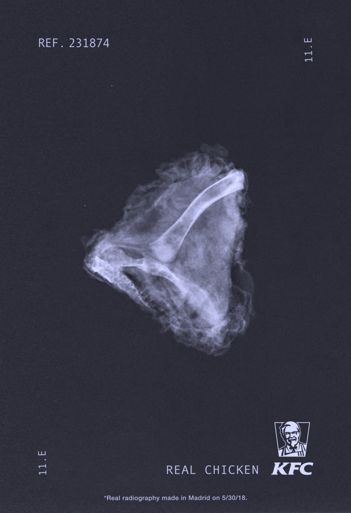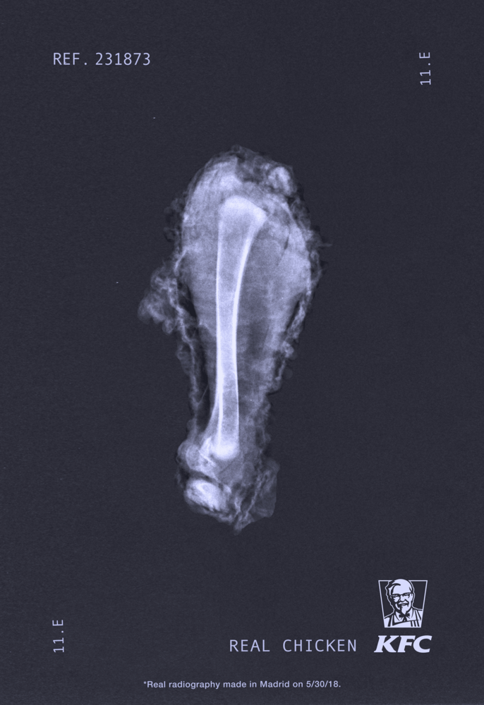 Kova menüleriyle dikkat çeken KFC, geçtiğimiz sene Kraliyet Düğünü için özel ürettim porselen kovalar hazırlamıştı. Kızarttığı tavukların güzelliğini ve çıtır çıtır oluşunu farklı projelerle göstermeye çalışan şirket, rahatlatıcı yağmur sesine rakip olup kızaran tavukların sesini hazırladığı bir sitede uzun bir ses kaydı olarak yayınlamıştı. Patlama sahnelerindeki ateş yerine yerleştirilen KFC tavukları ise iştah açıcı olduğu kadar ürünün acılı ve baharatlı olduğunu sonuna kadar hissettiriyordu. KFC yeni reklam projesi ile çıtır ve güzel gözüken ürünlerinin aynı zamanda sağlıklı ve gerçek bir tavuk olduğuna vurgu yapmak istiyor. Madrid merkezli ajans PS21, KFC ürünlerinin gerçekliğine vurgu yapmak için basit ama etkili bir yol buldu. Kızarmış tavuklarının röntgenini çekti.