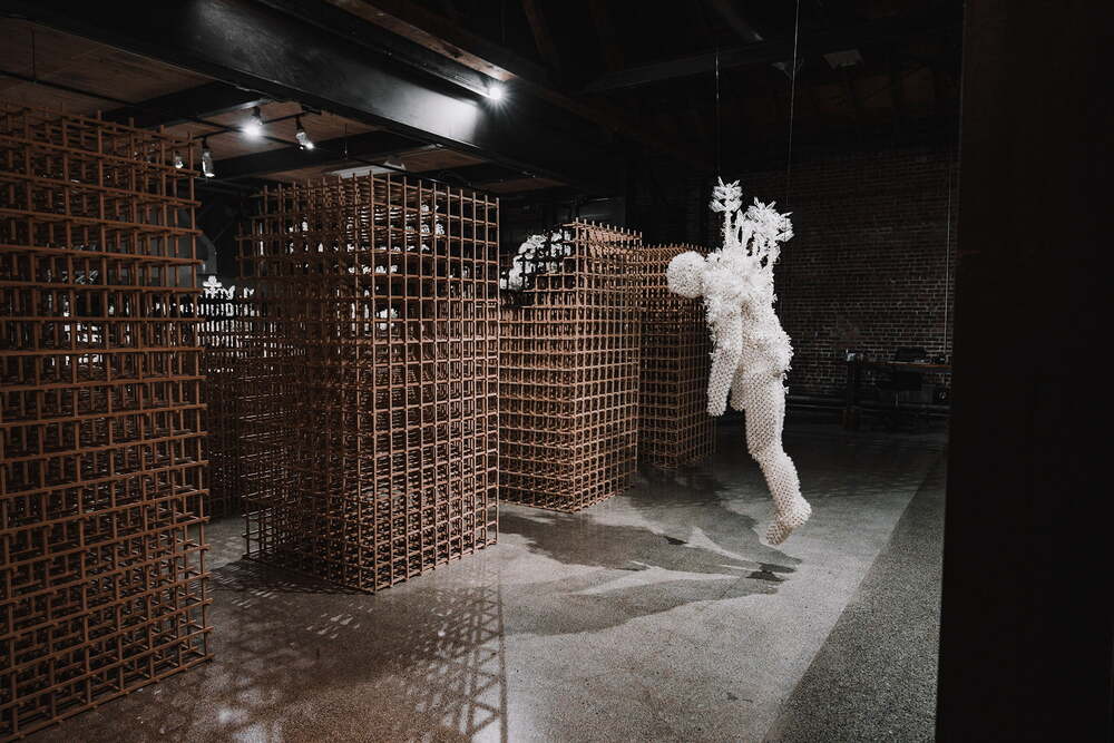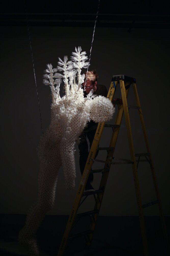 Seattle’da MadArt’ta 17 Nisan’a kadar sergilenecek olan yerleştirme çalışması Parable of Gravity, izleyicide bir nebze distopya hissi uyandırıyor. Çünkü narin çiçek bahçesinin altında karanlık görünümlü kafesler de görünür durumda. Curran nabız gibi atan bitki bahçesini 20 adet kafesten kulenin üzerine yerleştirmiş. Kalın bir çamur tabakasıyla kaplanmış olan bu kafes yapılar, yerleştirmenin en dış çeperinde sekiz fite (2,44 metre) kadar yüksekliğe çıkabiliyor. Yerleştirmenin dikkat çekici parçalarından biri de havada süzülüyormuş gibi görünen bir figür. Bu figür de çiçeklerle aynı dokuya sahip. Bu figürün gövdesi de yerleştirmenin geri kalanında olduğu gibi, lazerle kesilmiş polyester çizim kağıtlarından yapılmış çiçeklerle kaplı. Figürün üzerindekiler de dahil olmak üzere yerleştirmenin tamamında çiçeklere hareket veren sistem, kranklardan ve küçük motorlardan oluşuyor.