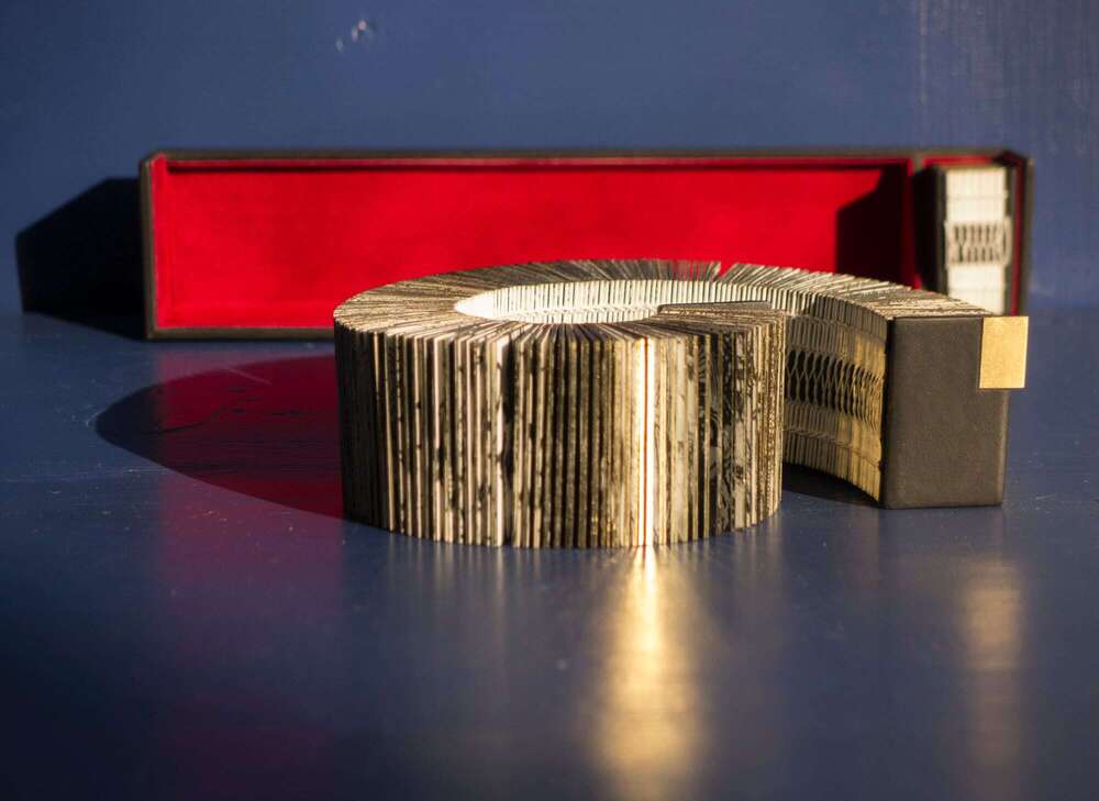 Amsterdam merkezli Lyske Gais ve Lia Duinker ikilisinin tasarladığı bu bilezik, içinde geniş bir sanat tarihi koleksiyonunu barındırıyor. Kitap, yaldızlı kenarlarla astarlanmış ve 1.400 minyatür sayfa altın bir tokayla sabitlenmiş. İçerik olarak, Rembrandt’a ait 303 adet gravür ve çizimden oluşuyor. Sayfaların yapımında kaynak olarak Rijksmuseum’un dijital arşivindeki materyaller kullanılmış. Sanat ve tasarım ikilisi, bu mini kitabı yaparken giyilebilir bir şey olması ve sevdikleri koleksiyonu üzerinde taşıma fikriyle hareket etmiş.