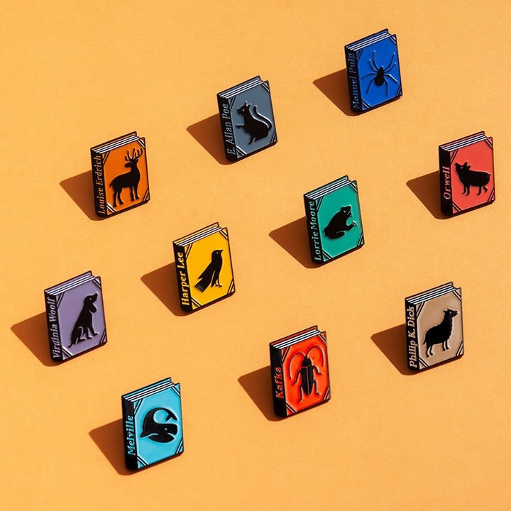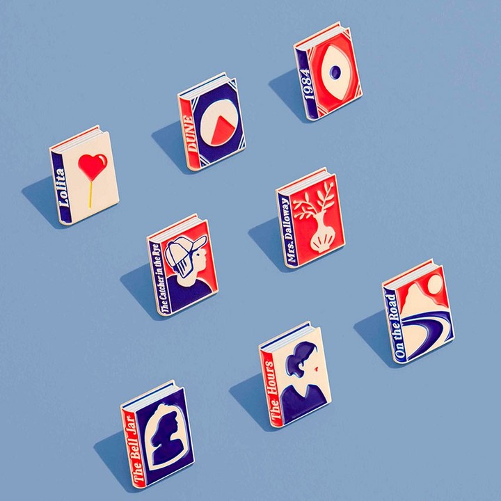 “A Book to Wear” koleksiyonunda bir yaka iğnesinin hangi kitabı ya da yazarı temsil ettiğini ilk bakışta anlayabiliyorsunuz. Minik emaye kitapların üzerinde ya yazarın portesi, ya başkahramanın portresi ya da hikaye ile ilgili çok bilindik bir sembolün imgesi yer alıyor. Örneğin yalnızca bir balina figürünün ve “Melville” yazısının olduğu yaka pininin Moby Dick’i temsil ettiğini hemen anlayabiliyorsunuz. Küçücük yüzeylerde de olsalar illüstrasyonlar çok sade ve evrensel.