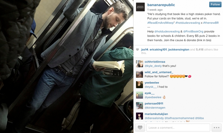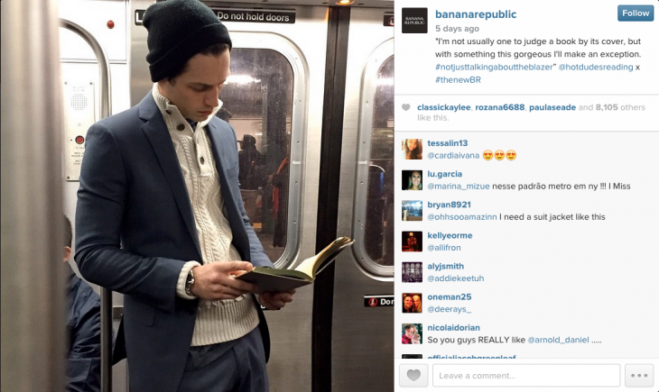 Hesabın orijinal yakışıklılarının, Banana Republic bahar koleksiyonu içinde poz veren modellerden pek de geri kalır yanı olmadığından, sponsorlu gönderilerle gerçek gönderiler arasındaki fark belli belirsiz. “The Hot Dudes Reading” takımı, hesabın kimliği ve dilinin bozulmaması için ellerinden geleni yapmışlar ve fotoğraf başlıklarında dahi Banana Republic’le omuz omuza çalışmışlar.