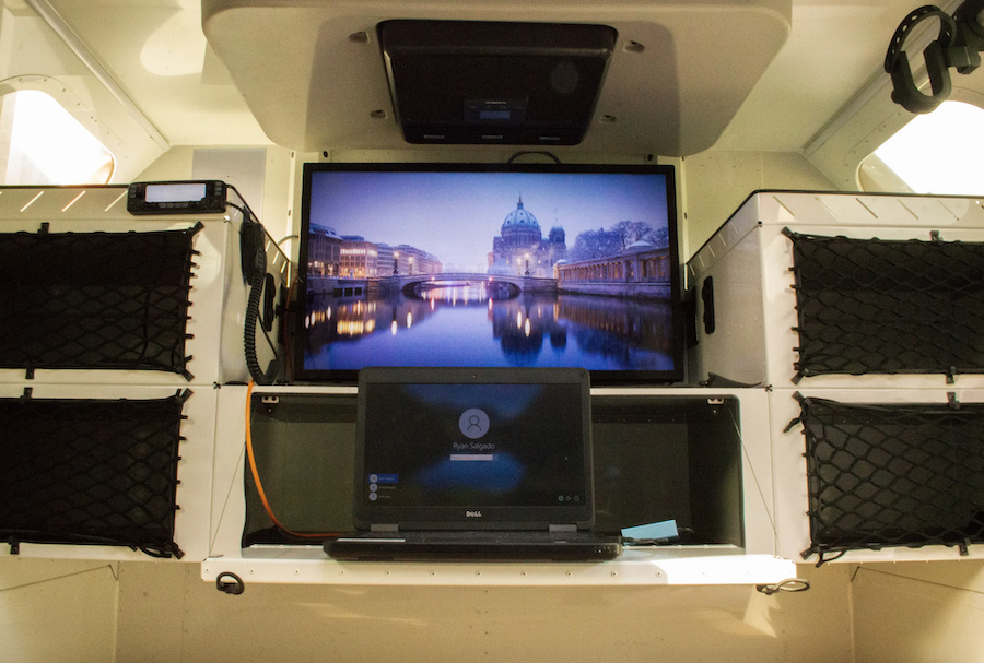 Ortama daha da geniş bir hakimiyet isteniyorsa, tavana monte edilmiş bir kapak insansız hava aracı konuşlandırma sistemine hızla erişmeyi sağlıyor. Ayrıca yerleşik bir meteoroloji istasyonu ve radyasyon ölçen geiger sayacı da içeriyor. Bağlantı için de Starlink internet ve çift bantlı radyo iletişimi kullanılabiliyor. Dört adet 100 Ah Renogy akıllı lityum pil, 20 saate kadar elektrik sağlıyor ve tente üzerindeki iki adet 100 W güneş paneli aracılığıyla pil şarj edilebiliyor. Şarj işlemi, hareket halindeyken de sürdürülebiliyor. Yedek olarak da bir Wen portatif gaz jeneratörü eklenmiş.