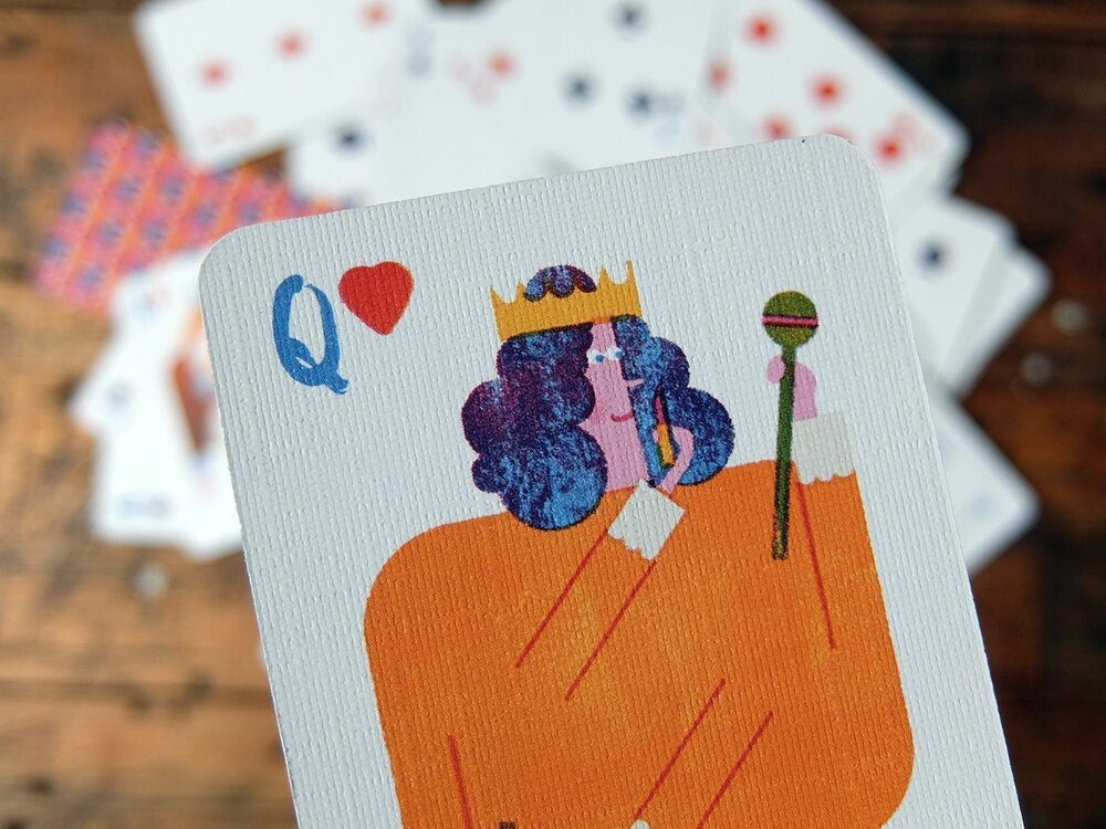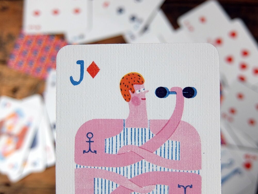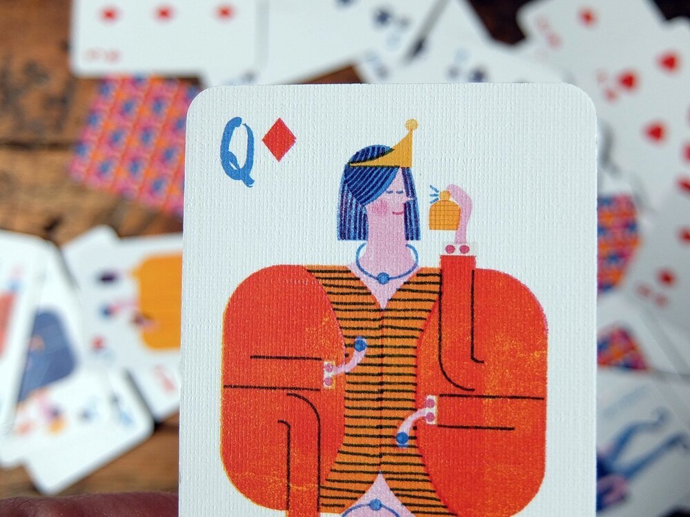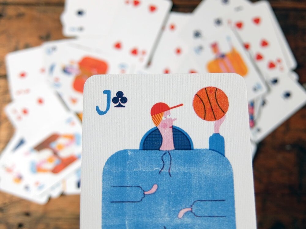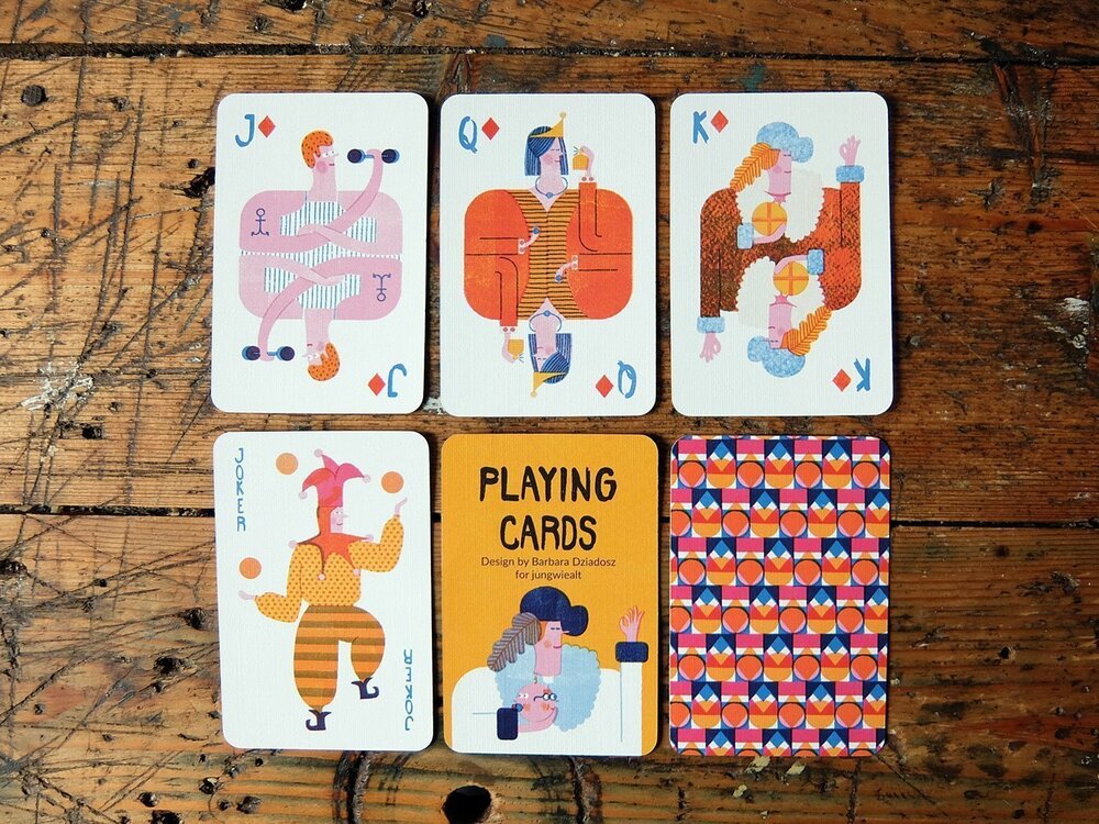 Alman illüstratör Barbara Dziadosz’un Playing Cards projesinde en dikkat çekici olan kağıtlar, figürlü olanlar. Alışık olduğumuz gibi kraliyet figürlerinin tasvir edildiği bu kartlarda, fark bu figürlerin hem verdikleri pozlarla hem de çizim stiliyle çağdaş bir havaya sahip olmaları. Örneğin valeyi sokak basketbolcusu, akıllı telefonu ve hazır kahvesiyle takılan ya da spor salonunda ağırlık kaldıran dövmeli bir genç olarak görüyoruz. Queen/kız ise parfümünü sıkarken ya da rujunu sürerken tasvir edilmiş.