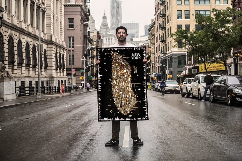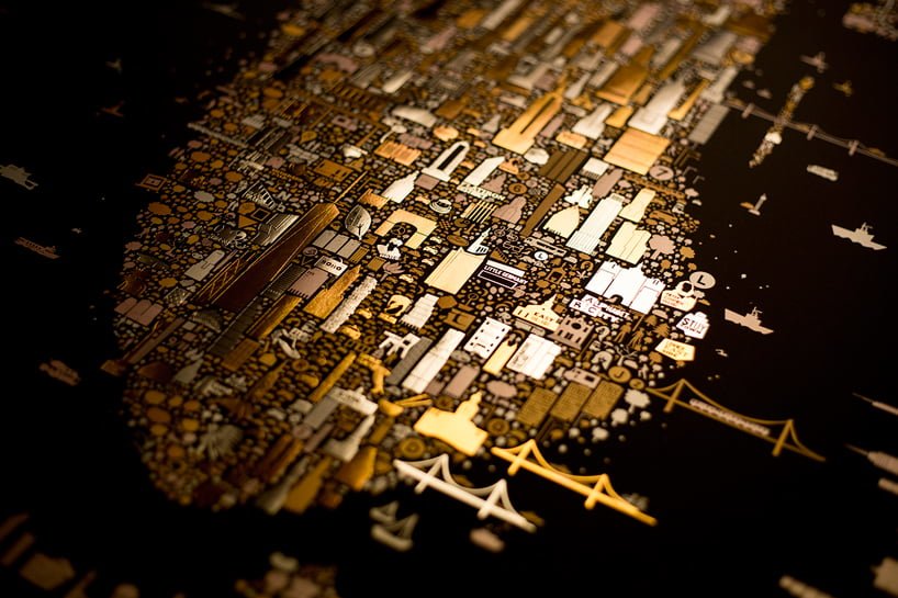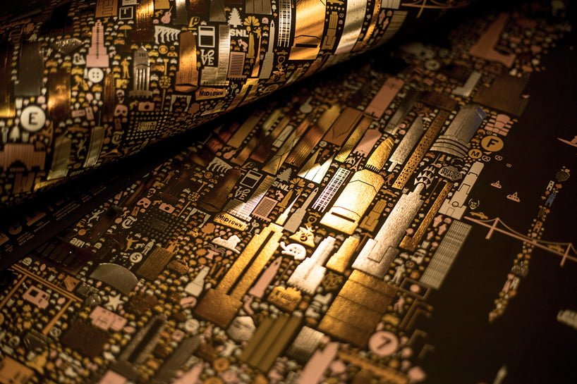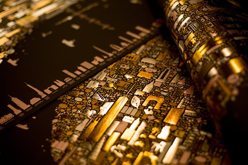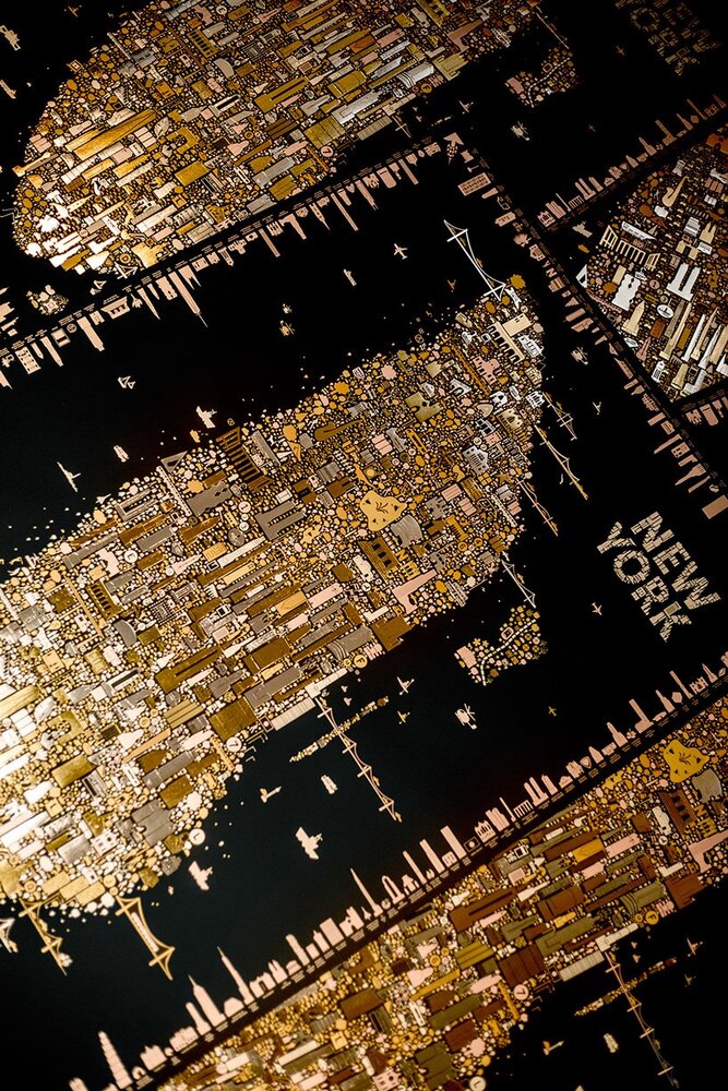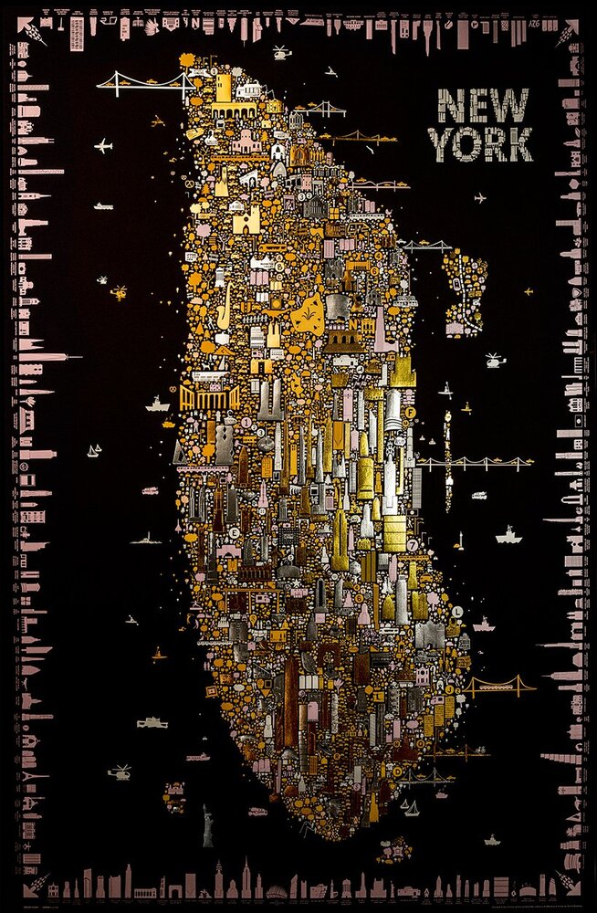 Altın sarısıyla, gümüşi yaldızlarla ve ışıldayan metalik mürekkeple tasvir edilmiş “Iconic New York Illuminated”; parlak New York gecelerinin ve şehrin sınırlarının kutlaması niteliğinde bir çalışma.