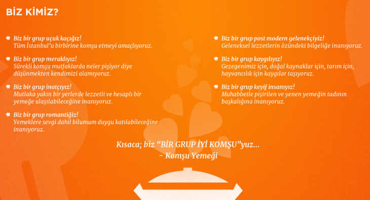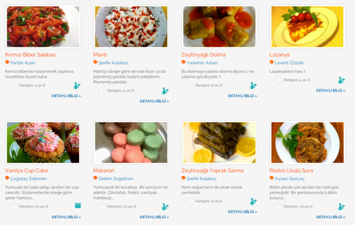 Siteye girdiğinizde yemeği yapan mı yoksa yiyen mi olduğunuza dair bir profil oluşturabiliyorsunuz. Ardından kategorilerin içinde canınızın ne istediğine göre karar verebiliyorsunuz. Mezelerden, ekmek arasına kadar geniş bir seçenek sizi bekliyor. Günlük yemekler saat 8.00 ile 13.00 arasında çıkıyor. Üstelik site yemek yapanlar için önemli tüyoları da bünyesinde bulunduruyor. Yemeklerinizi nasıl daha cazibeli hale getirebileceğinizin ipuçlarını veren site aynı zamanda yaptığınız yemeğin fotoğrafını iyi çekebilmenin de yollarını anlatıyor.