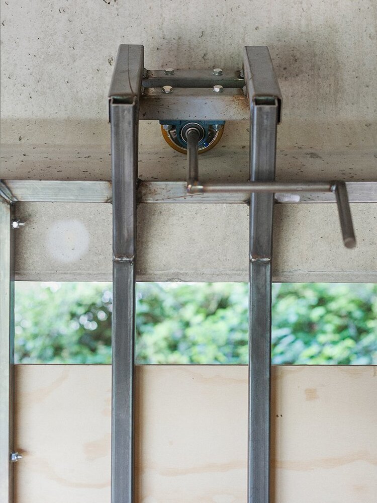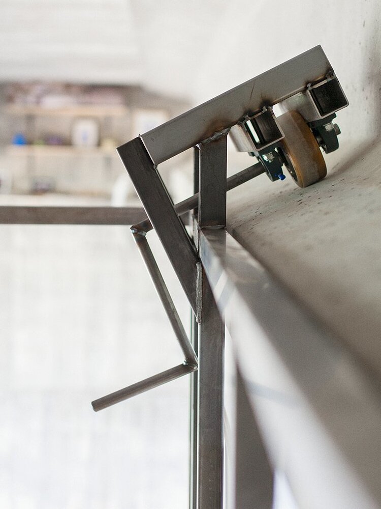 Abellanas, üzerinden her otomobillerin vızır vızır geçtiği, araç trafiği için yapılmış bir köprünün altına ray ve metal kutu düzeneğiyle kendi pop-up stüdyosunu kurmuş. Öyle ki raf, masa, sandalye ve yoldaşı olduğu iki köpeğin fotoğraflarını bu minik alana koyan tasarımcının üretmesi için gereken her şey mevcut. Abellanas, önce metal kutuya biniyor ve manivela yardımıyla raylı sistemi harekete geçiriyor. Böylece kutusu, eşyalarına doğru harekete geçiyor. Sonra odasının duvarlarını açıyor ve ofisi hazır hale geliyor.