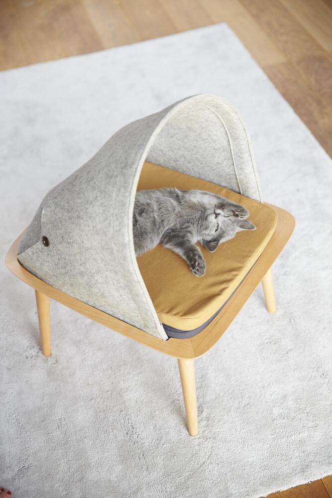 Bed’in %100 yünden yapılmış keçe ile kaplı yuva kısmı, diğerlerine oranla daha yüksek ahşap ayakların üzerinde duruyor ve kediye üstü daha ferah bir ortam sunarken bakış açısını da daha yüksekte tutuyor.