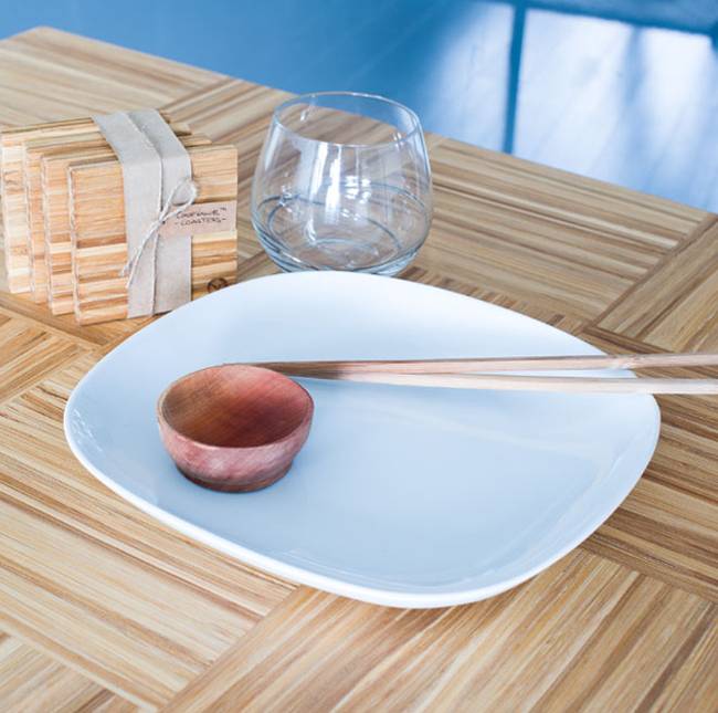 Çubuklardan elde edilen bambu levhalar kesilip raf, kesme tahtası, bardak altlığı hatta mobilyaya dönüştürülebiliyor. Aşağıdaki masanın yapımında 3.800’den fazla yemek çubuğu kullanılmış. Masanın bacaklarında da bölgedeki yıkım alanlarından toplanan atık çelik kullanılmış.