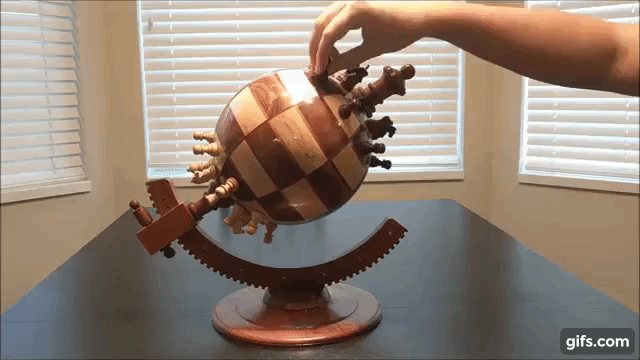 Tasarım öğrencisi Ben Myers, küre şeklindeki satranç tahtasıyla satranç oyununa farklı bir estetik görünüm kazandırmış. Myers, babasıyla birlikte hayata geçirdiği satranç tahtasının yapımında; ceviz, yumuşak akçaağaç ve jatoba ağacı kullanmış. Sekiz adet sekizgen halkadan oluşan kürenin parçalarını Myers tek tek ölçmüş, kesmiş ve yapıştırmış. Normalde kare adını verdiğimiz açıklı koyulu kutucuklar, küre şeklindeki tahtada dik kenarlarını yitirerek dışbükey parçalara dönüşmüş. Myers tasarımın hayata geçirilme sürecini Instructables’a da yüklemiş.