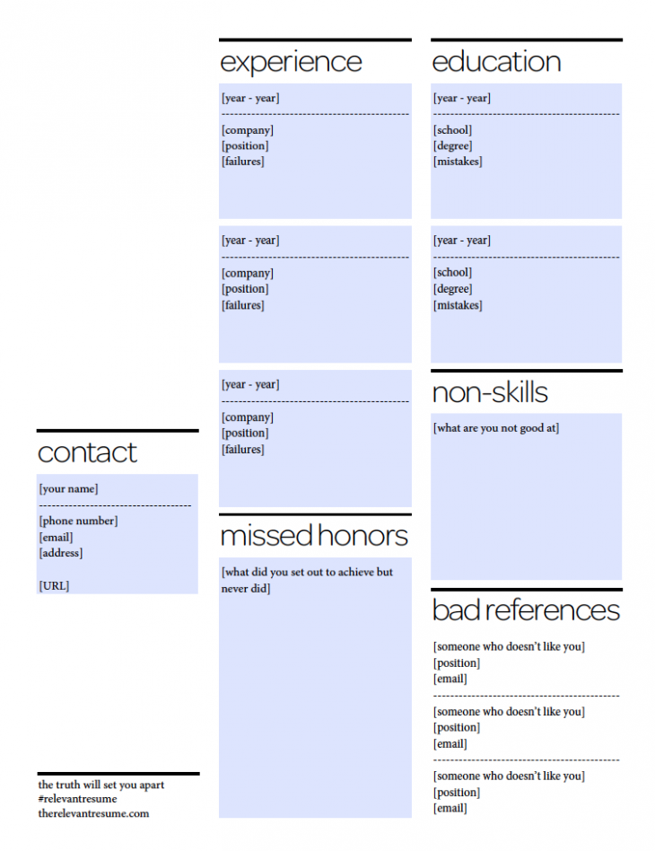Ogilvy & Mather New York yaratıcı grubundan Jeff Scardino bu duruma bir dur demek amacıyla The Relevant Résumé adı altında bir şablon geliştirdi. Bu özgeçmiş örneğinde iletişim bilgileri, eğitim ve deneyim gibi olağan detaylar dışında hedeflediğiniz ama gerçekleştir(e)mediğiniz dereceleri, yeteneğinizin olmadığı alanları ve hakkınızda olumsuz yorumlar yapacak kişileri kötü referans olarak vereceğiniz kısımlar yer alıyor.