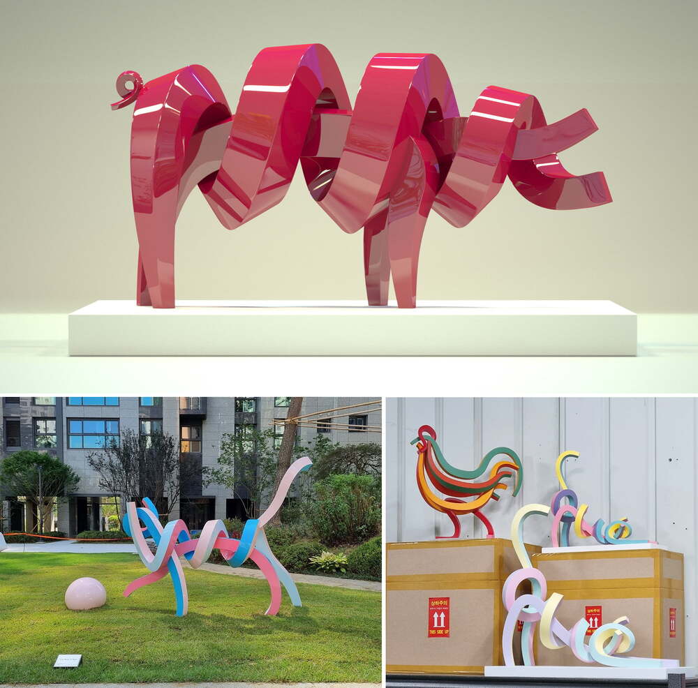 Sanatçı Lee Sangsoo, pratiğini bir tür “havaya yapılan çizim” olarak nitelendiriyor. Uzun metal şeritler onun elinde kedilere, flamingolara, köpeklere, papağanlara ve diğer hayvan figürlerine dönüşüyor. Heykellerde karışık malzeme kullanıyor. Ancak bir metreden daha geniş olan herhangi bir parçada mutlaka paslanmaz çelik ana malzeme. Metal şeritler yumuşak geçişlerle değişen renklere sahip. Bu renklendirme biçimi, figürlere hem boyut hem de daha güçlü bir temsiliyet yeteneği katıyor.