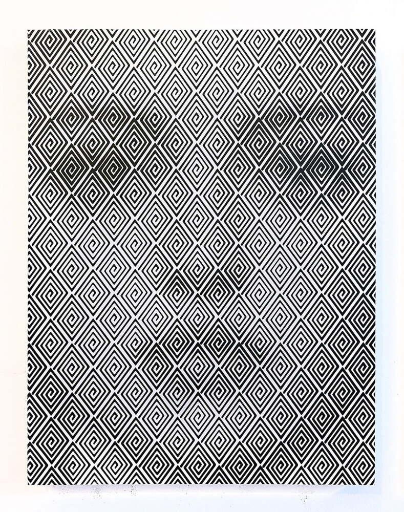 Bir portreyi desenlere entegre etmek için Wagstaff tasarımda çok hassas değişiklikler yapıyor. Örneğin “Morphic Resonance” adlı yukarıdaki tabloda, kilit bölgelerdeki (kaşlar, gözler, burun ve dudaklar) halkaların kalınlıklarını artırarak yüzü şekillendirmiş. Yine diğer tablolarında da açık – koyu geçişler ve kontur kalınlıklarını değiştirme gibi yöntemlerle hareket ettiği görülüyor.