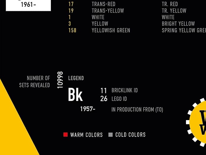 Periyodik tablonun ikinci versiyonunda renkler ilk versiyona göre biraz daha kullanışlı bir şekilde düzenlenmiş. Tabloyu tam ortadan bölen noktalı bir çizgi, ana bölümü sıcak ve soğuk tonlara bölerek aradığınız rengi hızlı bir şekilde bulmanıza yardımcı oluyor. Ek olarak, renkli parçaları daha iyi vurgulamak için mavi-sarı arka plan siyah-sarı olarak değiştirilmiş. İkinci tabloya eklenen bir başka yeni özellik ise bir rengin kaç sette göründüğünün belirtilmiş olması.