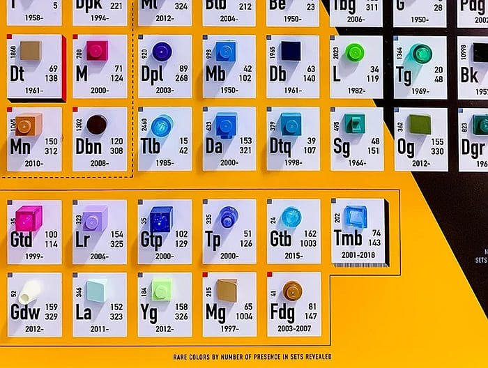 Kendini LEGO’ya adamış canlılar için topluluk oluşturmak üzere tasarlanmış tek duraklı bir oyun alanı olarak tanımlayan WLWYB (We Love What You Build) internet mağazında LEGO tutkunlarına özel ürünler sunuyor. İlk periyodik renk tablosunu birkaç ay önce çıkarmışlar. Bu defa Periodic Table of LEGO Colors V2.0 adlı ikinci bir tablo daha çıkarak daha da çok ses getirdiler.