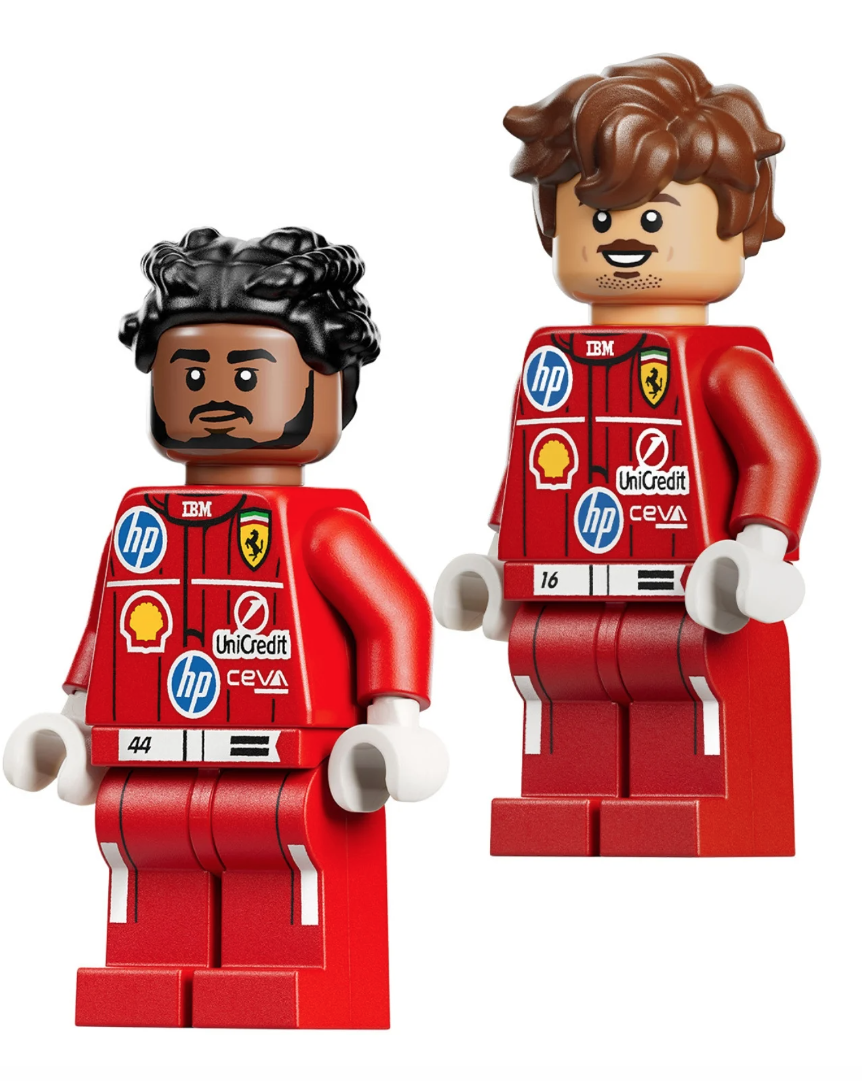 Minifigürler setin özenli tasarımını bir kez daha ortaya koyuyor. Lewis Hamilton figüründe sürücünün kıvırcık saçları, sakalı ve üzerinde araç numarası bulunan kırmızı Ferrari yarış tulumu yer alıyor. Charles Leclerc minifigürü ise pilotun bilinen sıcak ve samimi yüz ifadesini yansıtacak şekilde tasarlanmış. Bu figürler, tek başlarına bile masa üzerinde sergilenebilecek küçük koleksiyon parçaları olarak düşünülebilir.