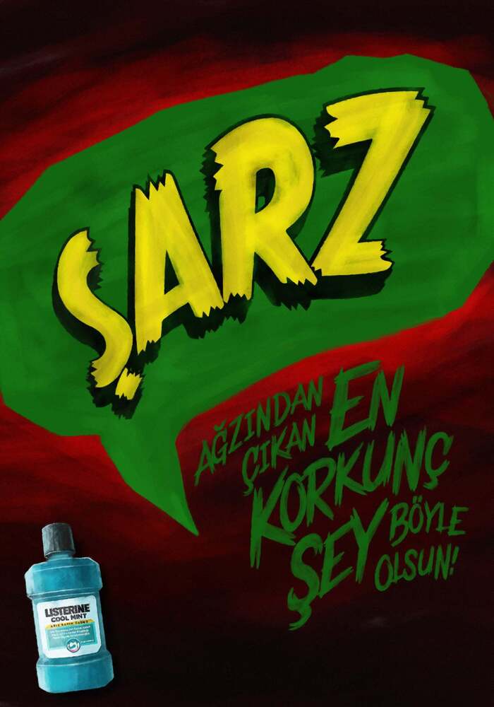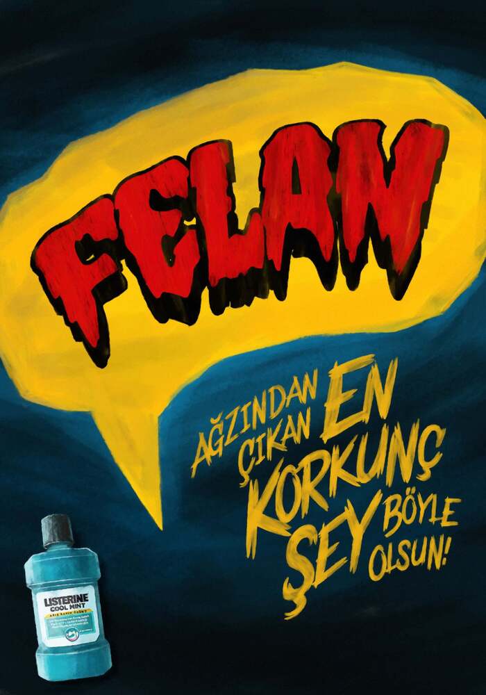 Bazı kelimeler var ki, yanlış kullanmaktan kendimizi alıkoyamıyoruz. Derslerde, eğitim hayatında anlatılsa da, düzeltilse de değişmiyor. Mesela şarz, kontür, şüfer, aşortuman, felan… Bu kelimeler adeta dile bir kere yanlış yollarla giriyor ve öyle kalıyor. Medina Turgul DDB de bu kelimelerin korkunçluğundan yola çıkarak ilanlar hazırladı. Listerine için hazırlanan ilanlar “ağzından çıkan en korkunç şey böyle olsun” diyor. Kimi zaman yanlışlıkla çıkan korkunç kelimeler çevrede kötü bir intiba bırakabiliyor, insanı utandırabiliyor. Ancak ağız kokusunun bundan daha kötü olaylara yol açabileceğini vurgulayarak farkındalık yaratıyor.