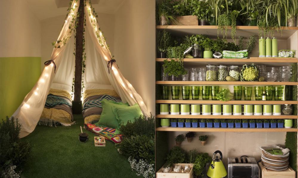 “Yeşil alan” anlamındaki Greenery, baharda uyanan bitkileri çağrıştırarak yeni başlangıçların sembolü olan sarımtırak bir yeşil. Daire de konukların bu “rengi yaşaması” amacıyla yapılmış. Pantone’un renk kartelasından bir parça gibi duran daire kapısı açıldığında; eğrelti otları, yapraklı kara yosunları, çimenler, ağaçlar ve kütüklerle yapılan basamaklar görülüyor. Airbnb’ye göre konuklar kapı eşiğinden “içeri” girdikleri anda, kendilerini tamamen “dışarıda” buldular. Ayrıca evin bakımından sorumlu olan olan görevli, Greenery renginde taze ve sağlıklı bir meyve suyu ikram ederek girişte konukları selamladı. Evin çevre dostu olduğu da vurgulanıyor. Bütün malzemeler mümkün olduğunca geri dönüştürülebilir olanlardan seçilmiş.