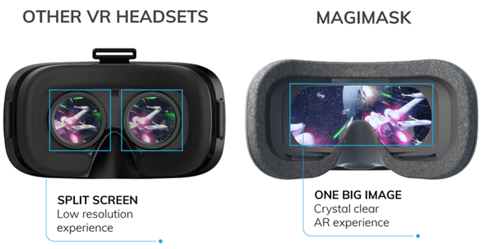Piyasadaki pek çok gözlük, iki parçaya bölünmüş görüntü sunuyor ve bu da her gözün kendi tarafındaki görüntüye bakmak durumunda olduğu bir görüntü biçimi. MagiMask’in en önemli özelliklerinden biri, bu iki parçalı görüntü yerine geniş bir görünüm sunması. Bu da MagiMask’in ardından dünyaya bakarken bir gözlük takıyormuş hissini yaşamamanızı ve adeta görüntünün içindeymiş gibi hissetmenizi sağlıyor. Bölünmüş görüntü sunan sıradan gözlüklerde piksellerin yaklaşık% 75’i inaktif oluyor. MagiMask’in eşsiz optik çözümüyle piksellerin %100’ü aktif oluyor ve bu da daha yüksek çözünürlük anlamına geliyor. Akıllı telefonunuzun ekranındaki tüm piksellerinin kullanılmasına olanak tanıyarak kristal berraklığında bir artırılmış gerçeklik deneyimi yaşatıyor.