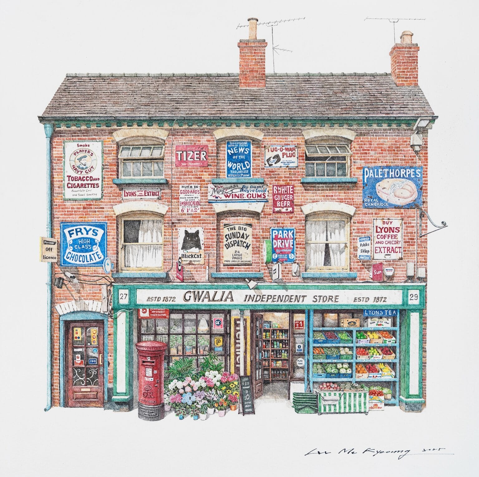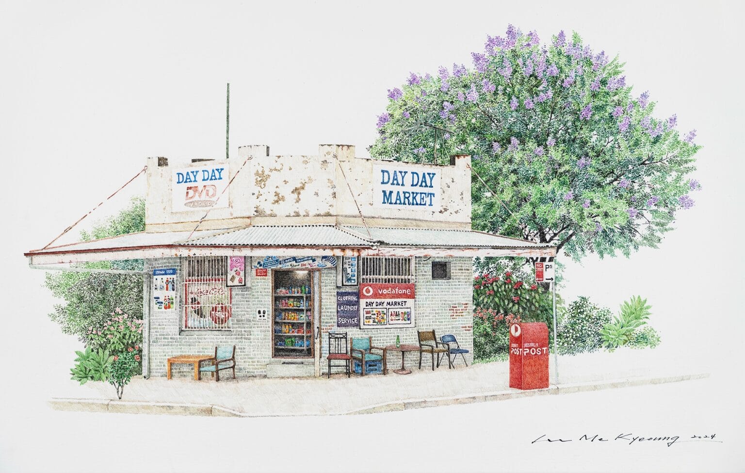 Lee Me Kyeoung, bu yapıları tükenmez kalem ve akrilik boya kullanarak detaylı bir şekilde resmediyor. Çalışmalarında; kiraz çiçekleriyle veya hurma ağaçlarıyla çevrili dükkânlar, tıklım tıklım raflar, kasa kasa dizilmiş ürünler ve camlara yapıştırılmış reklam afişleri gibi ince detaylara mutlaka yer veriyor. Kapı önlerinde bisikletler, banklar ve bazen de katlanır sandalyeler bulunuyor. Her çizim, o dükkâna özgü mimari detayları ve düzenlemeleri yansıtırken, kültürel benzerlikleri de onurlandırıyor. Gündelik hayatın sade güzelliklerine ışık tutarak, dünya üzerindeki mahalle kültürlerini zarif bir şekilde bir araya getiriyor.