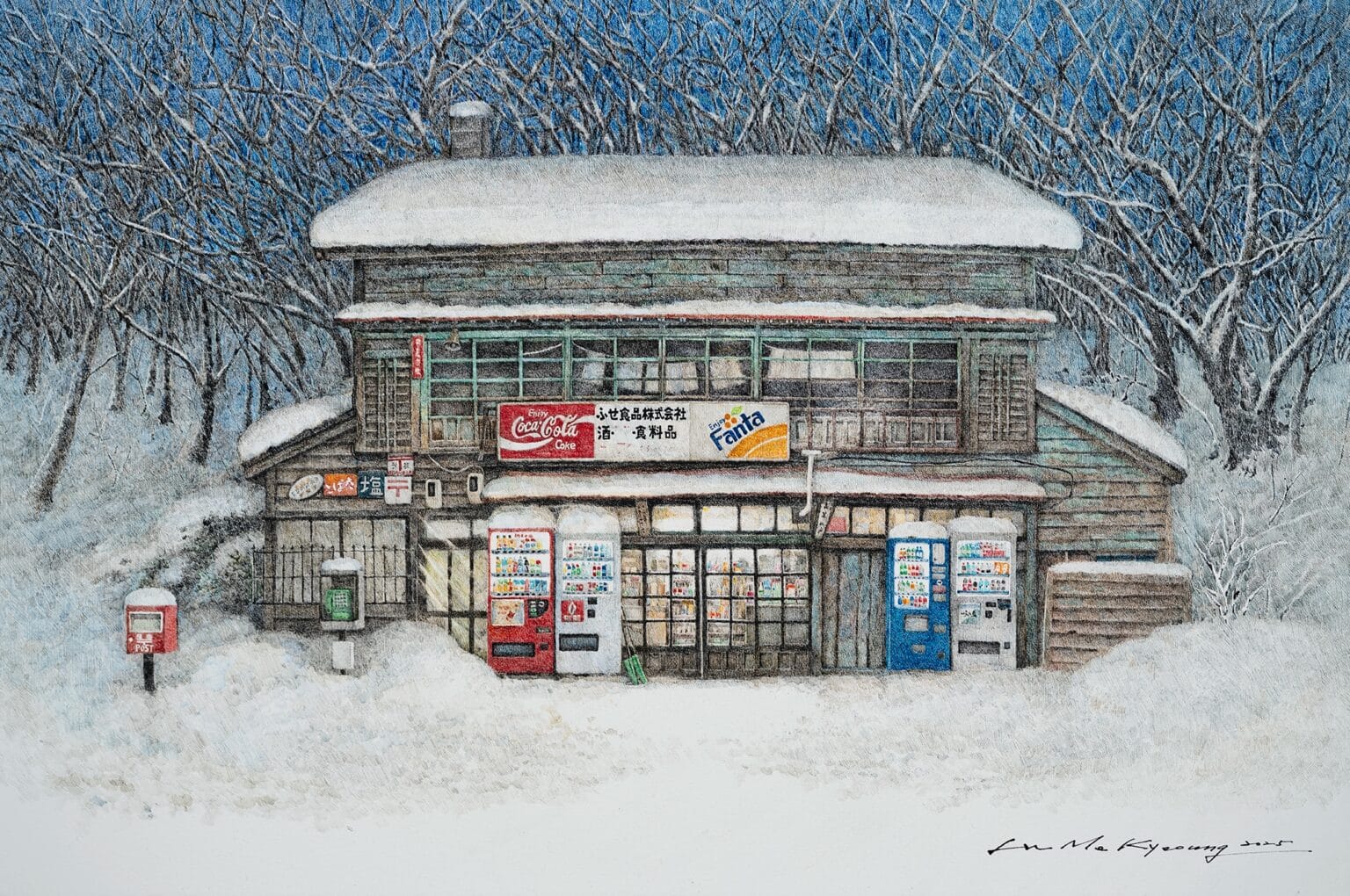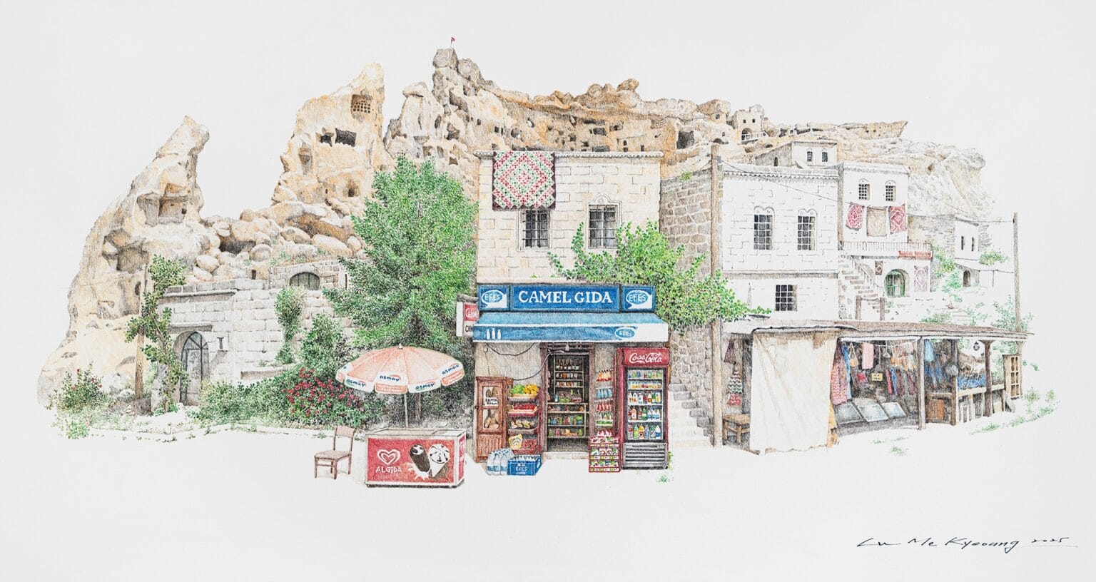 Lee Me Kyeoung, uzun süredir devam eden ve mahalle dükkanlarını konu alan çizim serisini Asya’dan Avrupa’ya genişletmeye devam ediyor. Sanatçı Türkiye’den Avustralya’ya, Vietnam’dan Nepal’e uzanan yolculuklarında karşılaştığı mahalle bakkallarını titizlikle resmediyor. Dağ eteklerine sıkışmış ya da kalabalık caddelerin köşelerine yerleşmiş bu küçük dükkânlar, bulundukları toplumun merkezi noktaları olarak dikkat çekiyor.