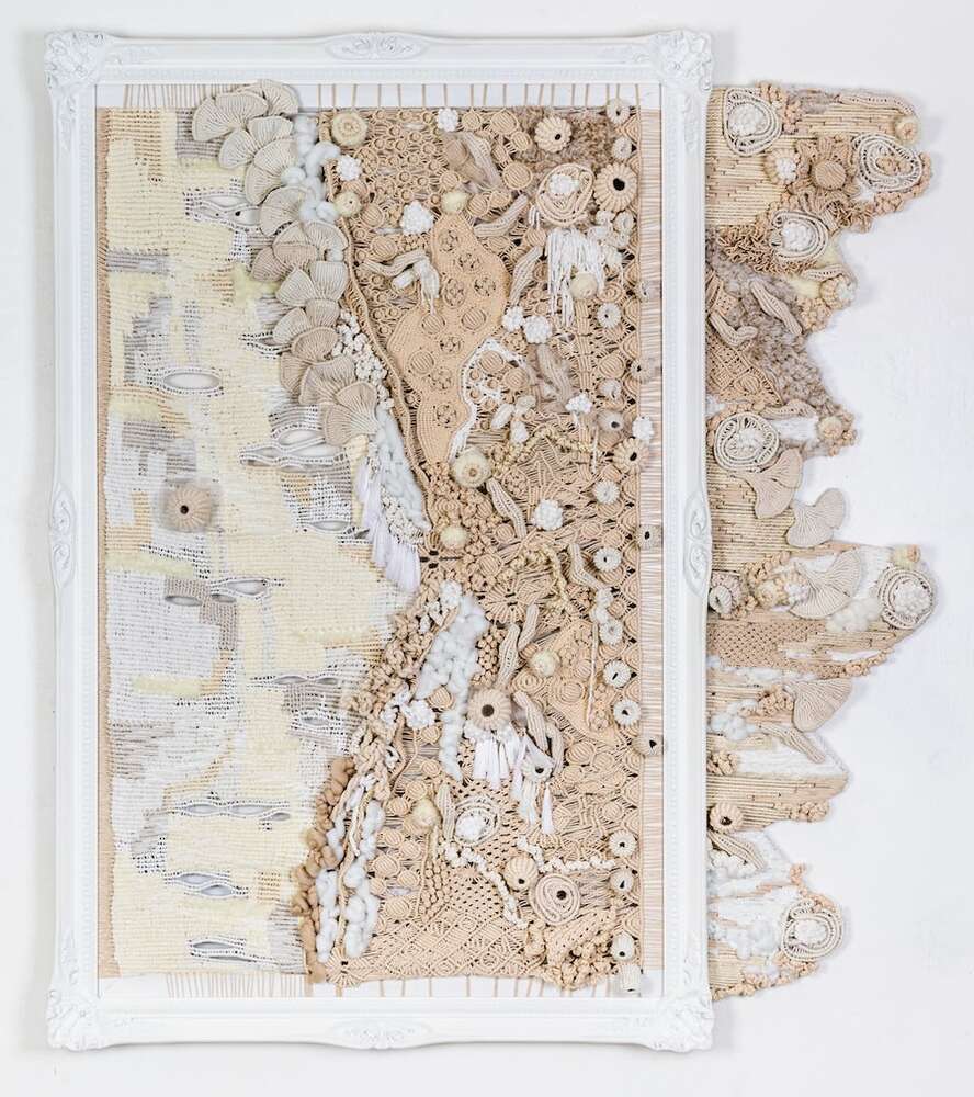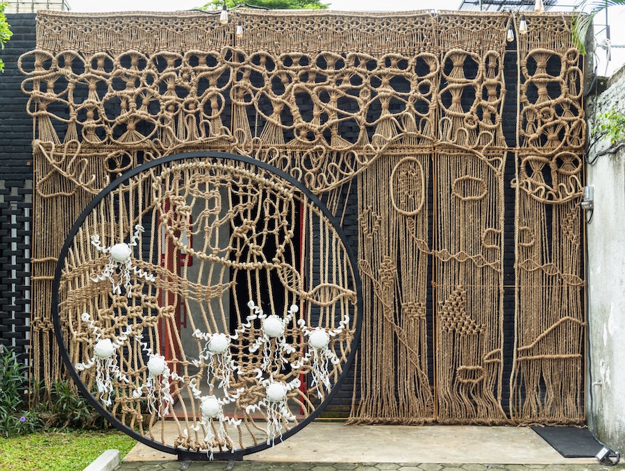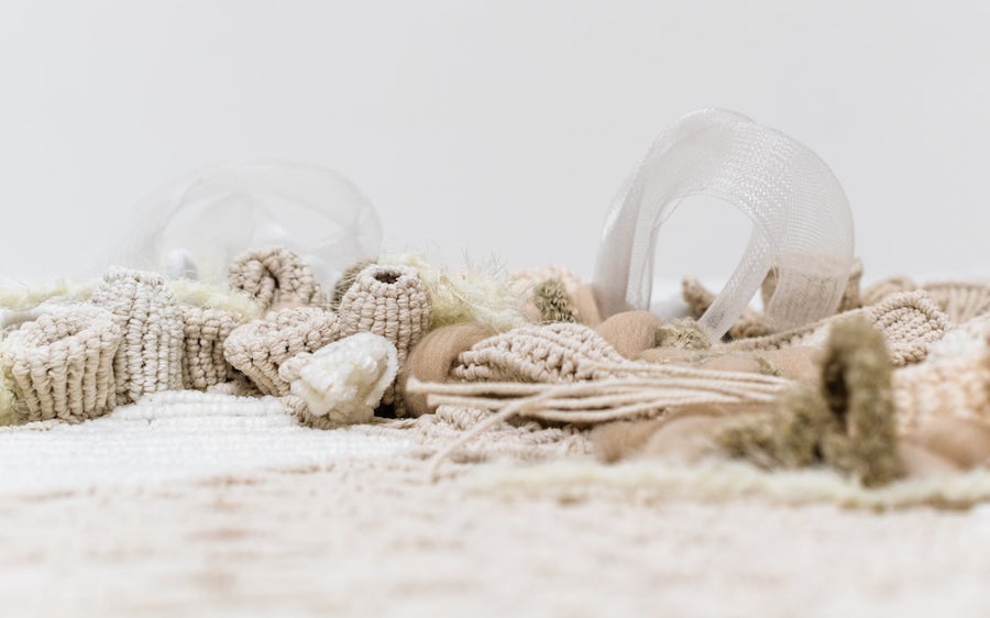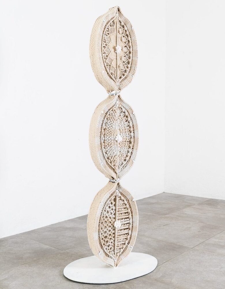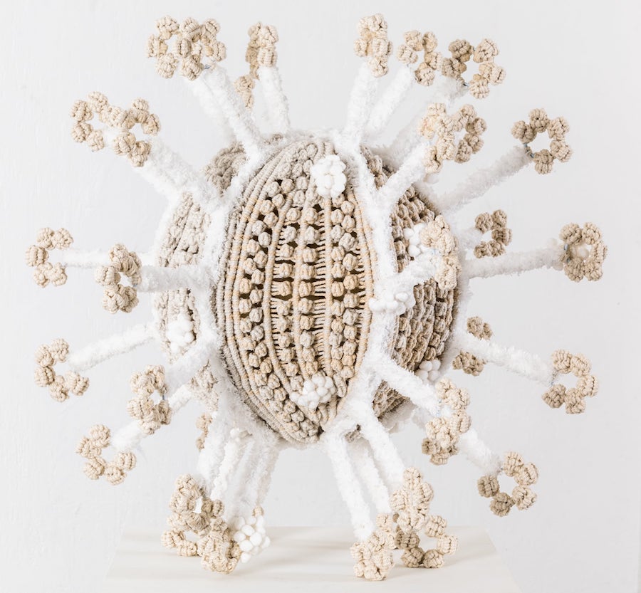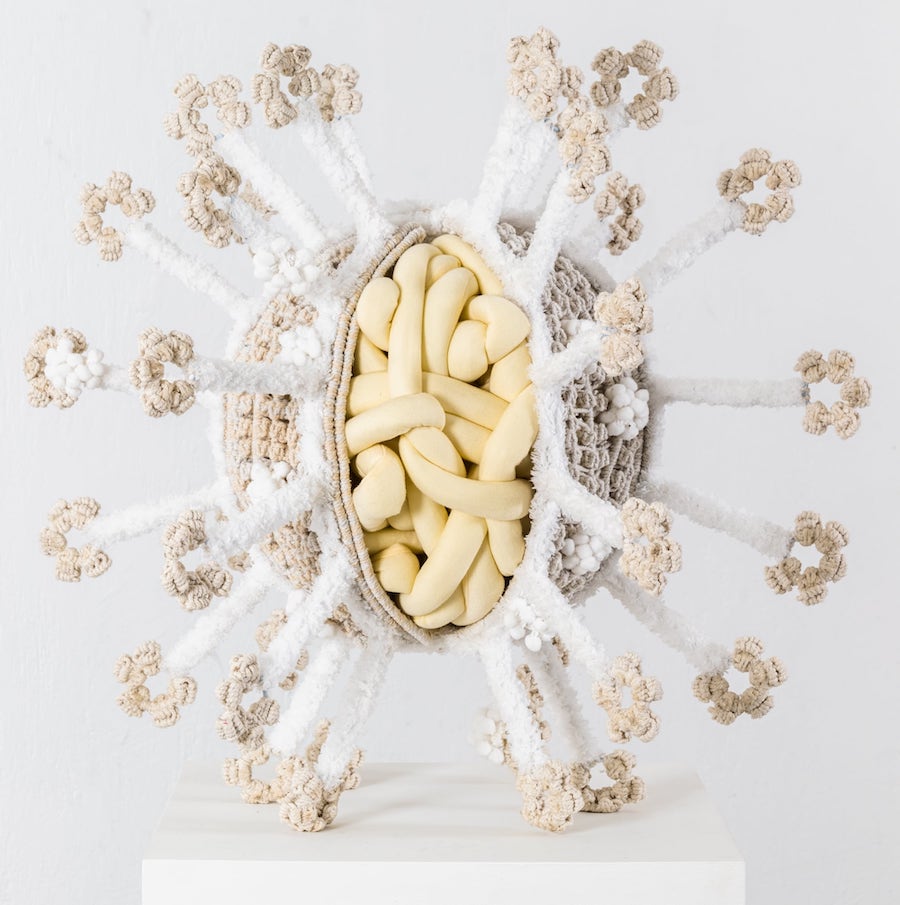 Hansella’nın makrome yerleştirmeleri ve heykelleri, yakın zamanda (5-17 Mart) NA Arthouse’da izleyiciyle buluştu. Serginin girişinde yaklaşık altı metrelik “Under Our Skin” yerleştirmesi asılıydı. Bu yerleştirme, epidermisi (derinin en dış tabakası) taklit eden bir perde oluşturuyor. Hemen önünde, bir mikroskop merceğini andıran büyük bir halka duruyor ve halkanın içinde tığ işi bakteriler yer alıyordu.